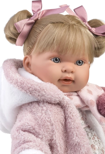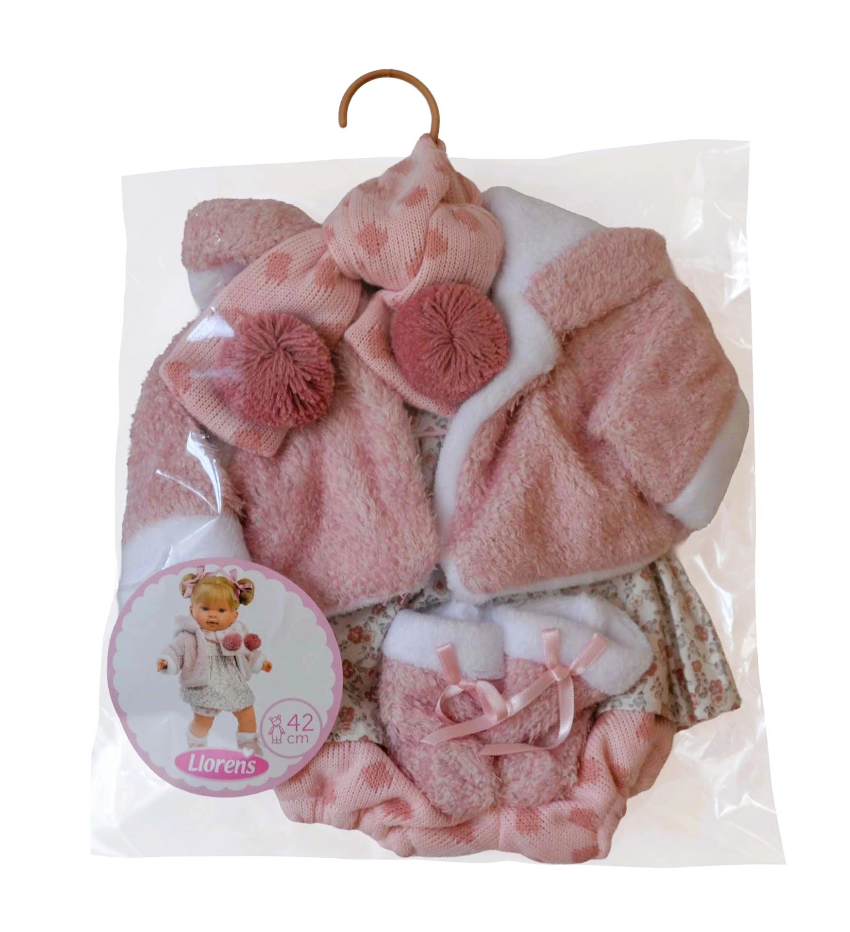 Een stijlvolle LLORENS-set voor poppen van 42 cm die elke kleine fashionista zal verrassen. Bevat 5 zorgvuldig op elkaar afgestemde items van zachte stoffen – een roze pluizige jas met witte bies, een muts/sjaal met pompons, wantjes en een bloemenjurkje met onderbroekje. De outfits zijn handgemaakt in Spanje en worden geleverd in een praktische hoes met hangertje. Ideaal voor fantasiespel en het ontwikkelen van de fijne motoriek. Geschikt vanaf 3 jaar.