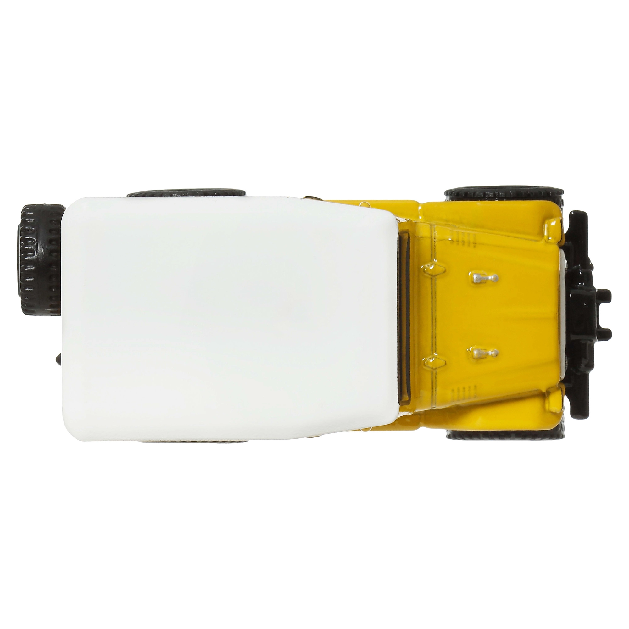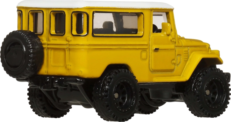 Gele carrosserie met wit dak, nauwkeurige proporties en realistische details van de klassieke Toyota Land Cruiser FJ43 uit de Hot Wheels Premium Boulevard-serie.