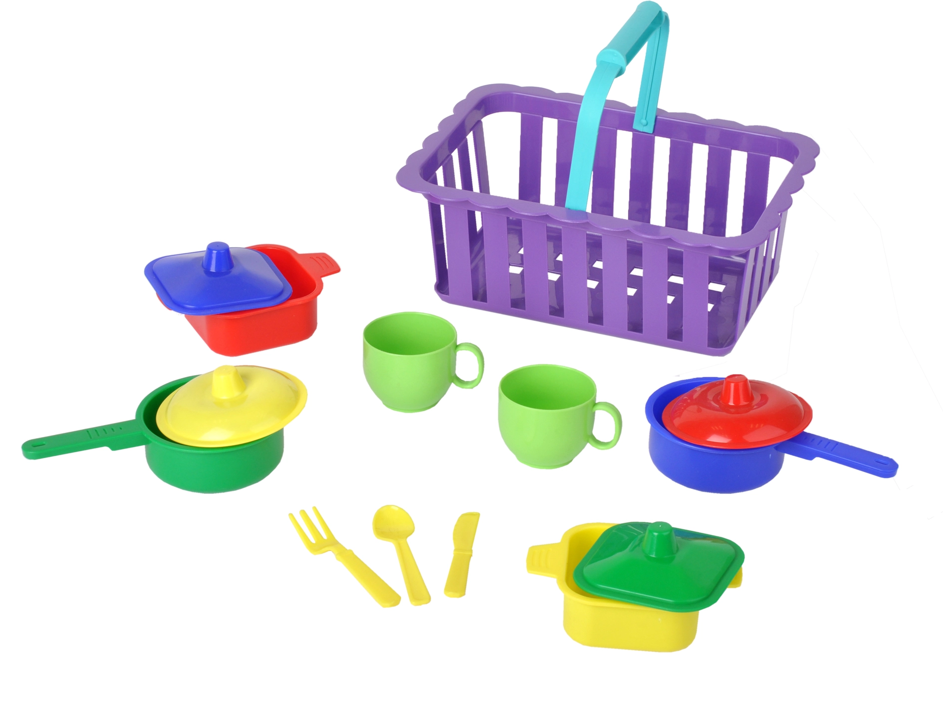 Een vrolijke kinderserviesset in een praktische mand die elke kleine kok en kokkin zal blij maken. Bevat potten, pannetjes, bekers en bestek in levendige kleuren. Dankzij de lichte mand is alles gemakkelijk te dragen en op te ruimen. Een geweldige keuze voor kookspelletjes, stimulatie van de verbeelding en oefening van de fijne motoriek.