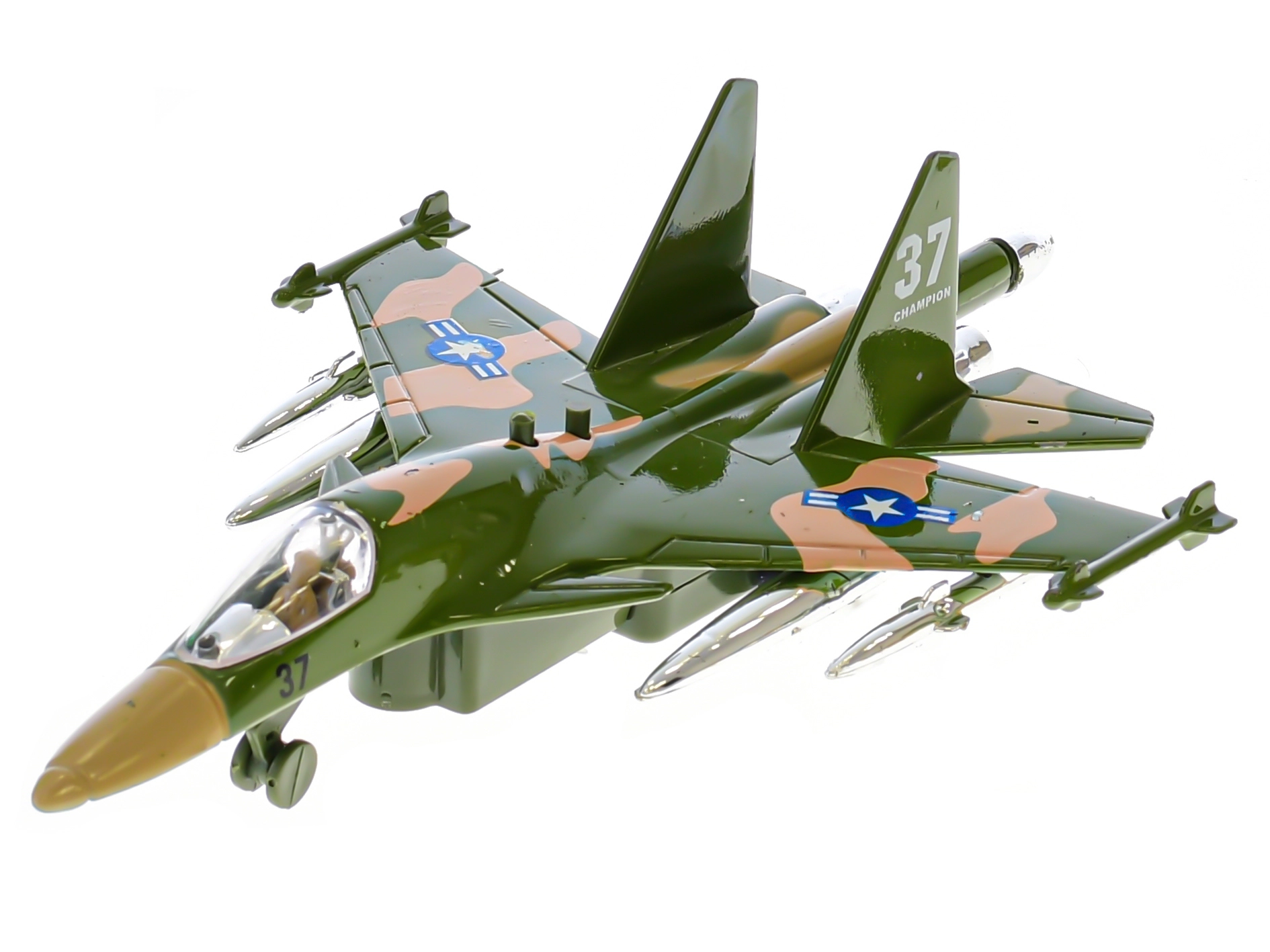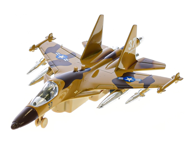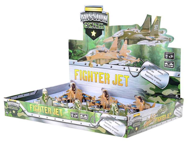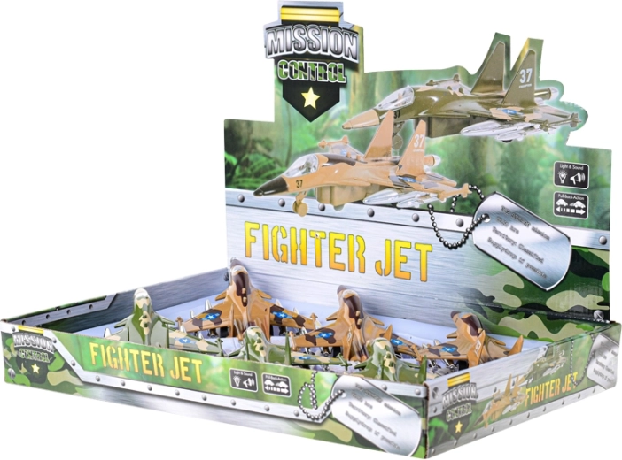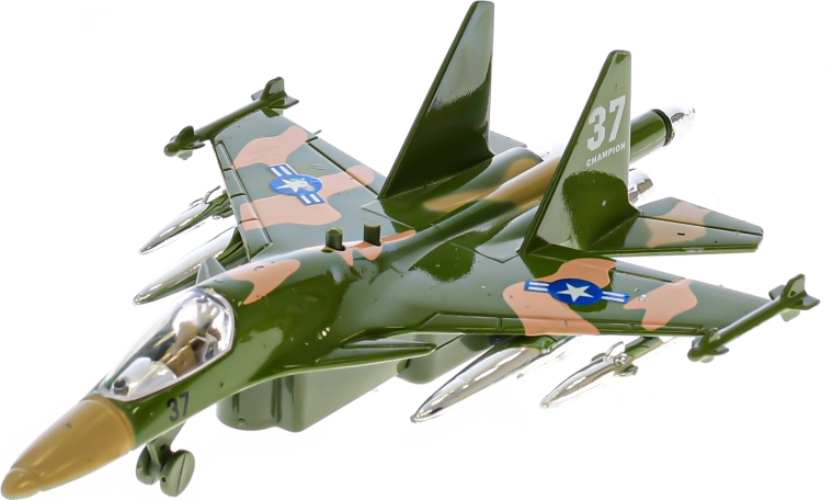 Dit gedetailleerd uitgewerkte militaire vliegtuig is ideaal voor jonge luchtvaartfans. Trek het naar achteren, laat los en door de pull-back aandrijving rijdt het weg als een echt toestel. Na het indrukken van de knop gaat het vliegtuig knipperen en klinkt het opstartgeluid, wat de speelbeleving versterkt.