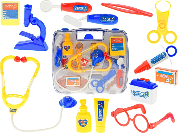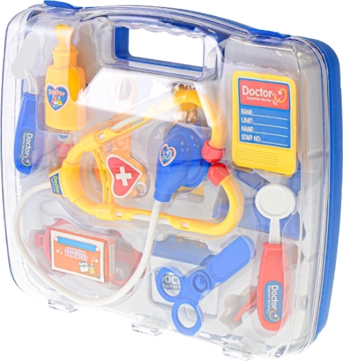 Leuke en leerzame doktersspeelset voor kinderen in een praktische koffer met 14 stuks plastic gereedschap die geen enkele kleine dokter of dokteres kan missen. Stimuleert fantasie, rollenspel en fijne motoriek en is ideaal voor de thuispraktijk en spelen met vriendjes.