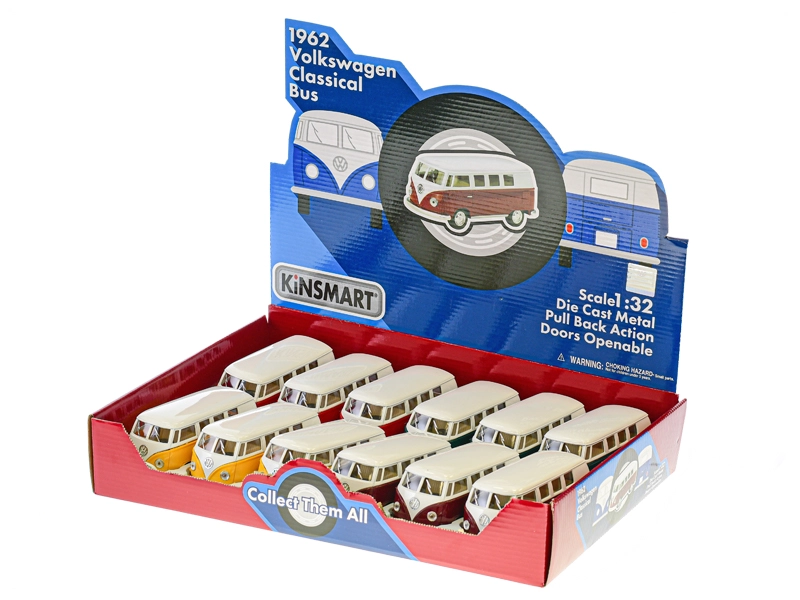 Ontdek het gedetailleerde metalen model van de legendarische microbus VOLKSWAGEN Classical Bus 1962 op schaal 1:32. Dankzij de pull-back functie schiet hij na het terugtrekken naar voren, openende deuren verhogen de realistische beleving en de combinatie van metaal en kunststof zorgt voor duurzaamheid. Ideaal voor verzamelaars en kinderen vanaf 3 jaar.