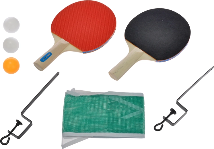 Twee batjes, drie ballen en een net met metalen klemmen – uitpakken en binnen een oogwenk spelen.