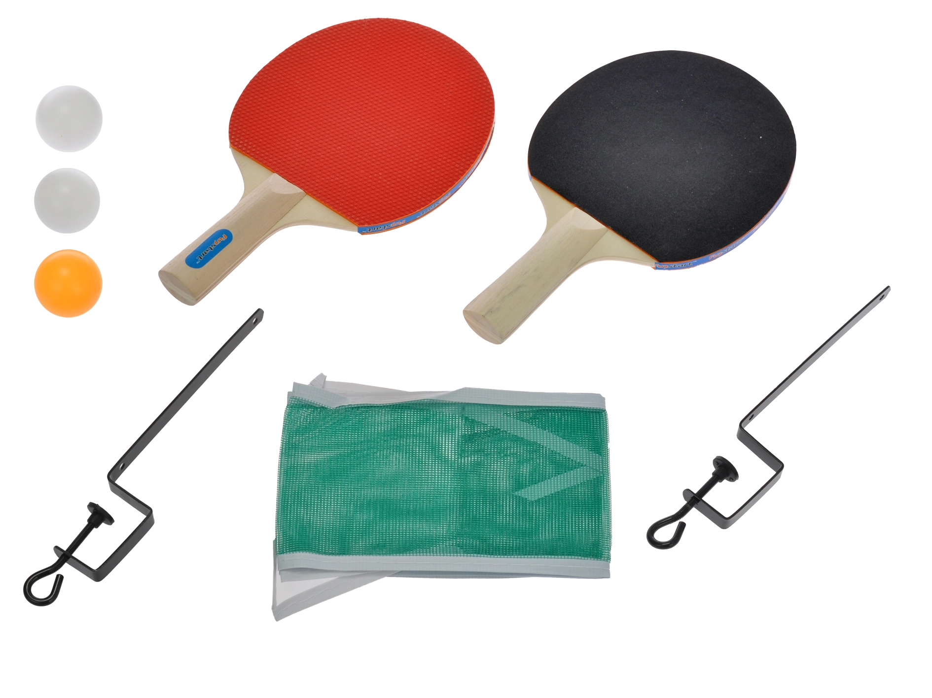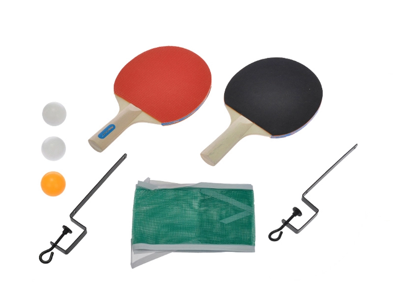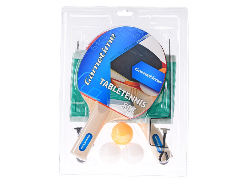 Deze universele GAMETIME-tafeltennisset laat je binnen een mum van tijd beginnen met spelen. In de verpakking vind je alles wat je nodig hebt: twee uitgebalanceerde houten batjes met rubberen toplaag voor een zekere slag, drie duurzame ballen en een stevig net met metalen klemmen voor stabiele bevestiging op de meeste tafels.