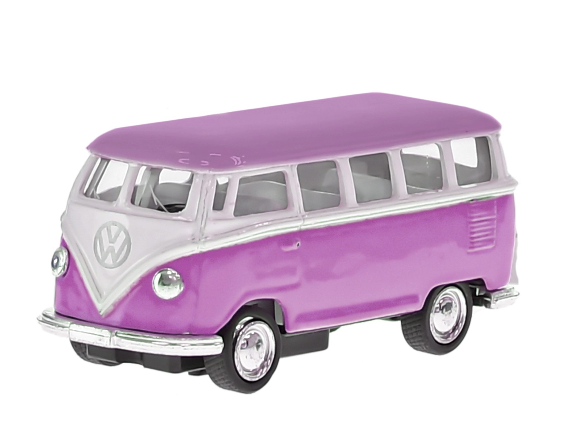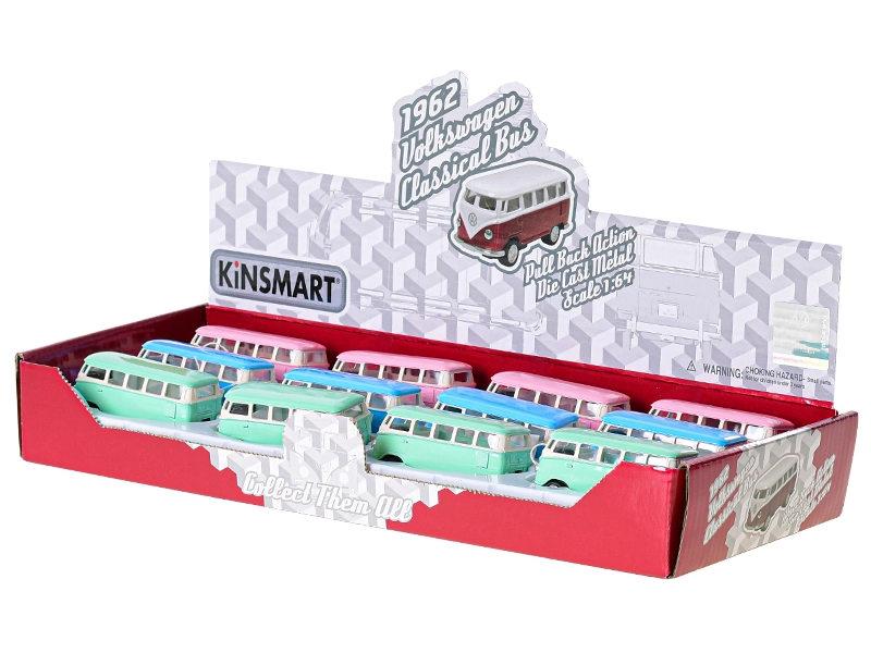 Gedetailleerd metalen model van de iconische Volkswagen Bus 1962 op schaal 1:64, perfect voor verzamelaars en kinderen. Biedt een realistisch design, terugtrekmotor voor zelfstandig rijden en openende deuren. Dankzij de combinatie van metaal en kunststof is hij stevig en licht, 7 cm lang en verkrijgbaar in drie kleurvarianten. Geschikt voor kinderen vanaf 3 jaar.