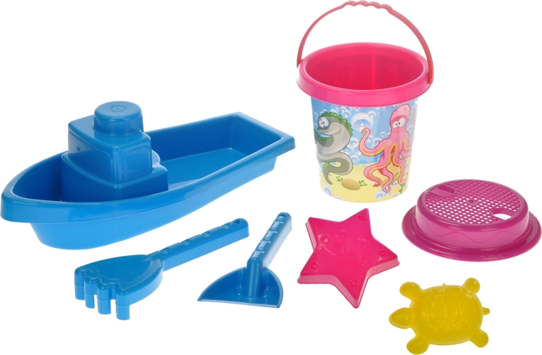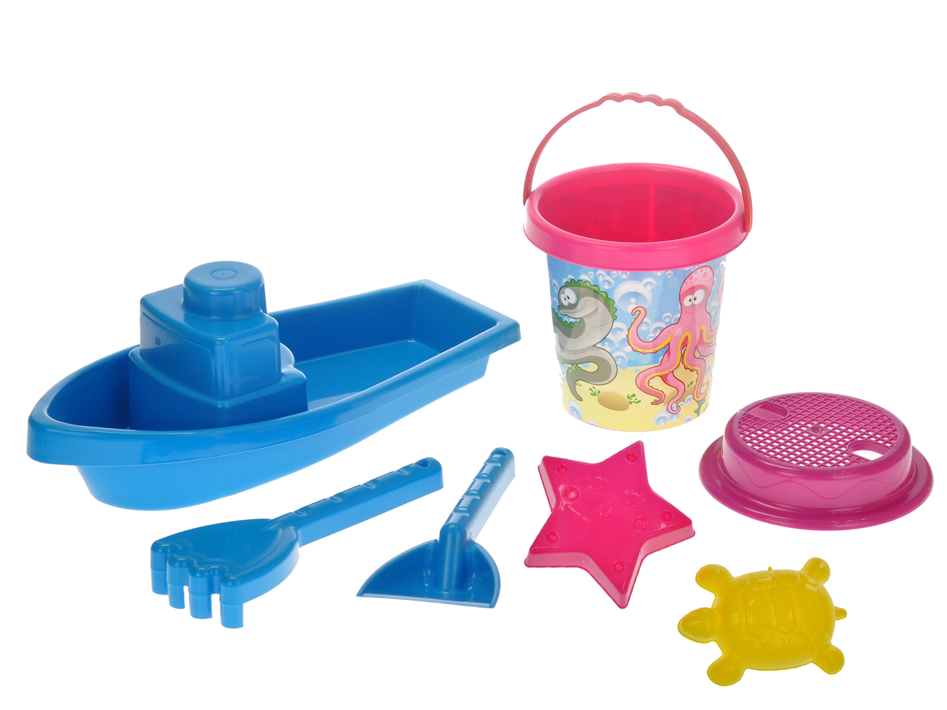 Leuke 7-delige zandset met boot voor kleine ontdekkers in zandbak en water. Bevat een emmer, schep, hark, zeef, zandvorm en boot in vrolijke kleuren die kinderen direct aanspreken. Gemaakt van hoogwaardige, veilige kunststof die bestand is tegen beschadiging. Geschikt vanaf 10 maanden ter ondersteuning van de fijne motoriek en creativiteit. Praktische verpakking in net voor eenvoudig dragen en opbergen.