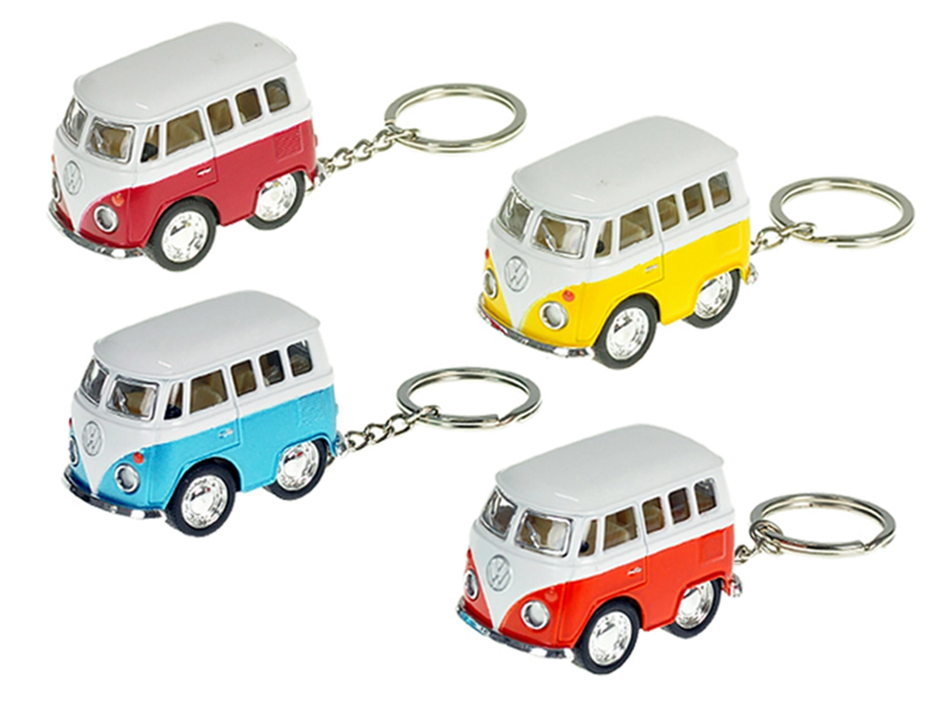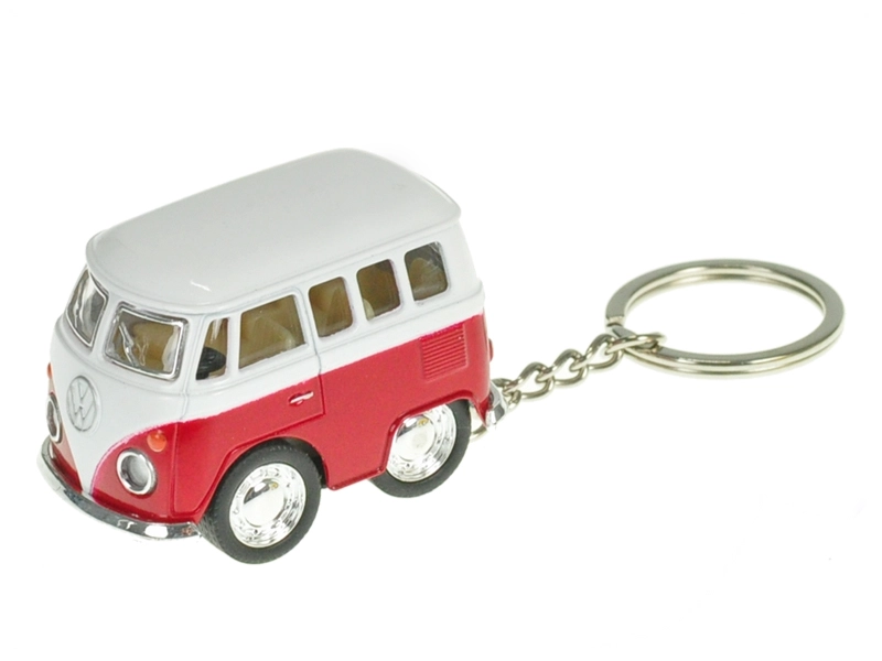 Stijlvolle sleutelhanger in de vorm van de iconische Volkswagen microbus die zowel kinderen als volwassenen zal bekoren. Het gedetailleerde model van 5 cm combineert duurzaam metaal en kunststof en dankzij het pull-back mechanisme rijdt het na opwinden vanzelf naar voren. Verkrijgbaar in vier kleuren – rood, blauw, geel en oranje.