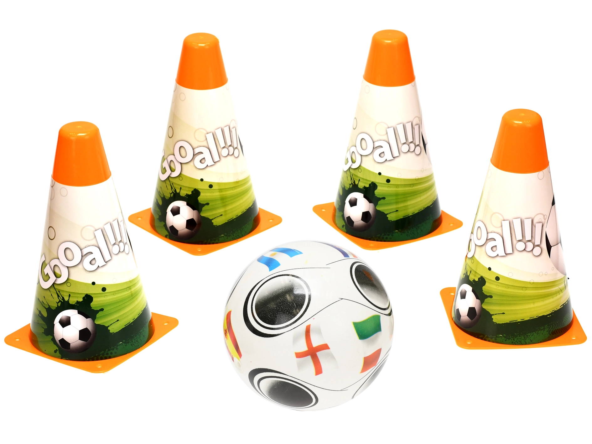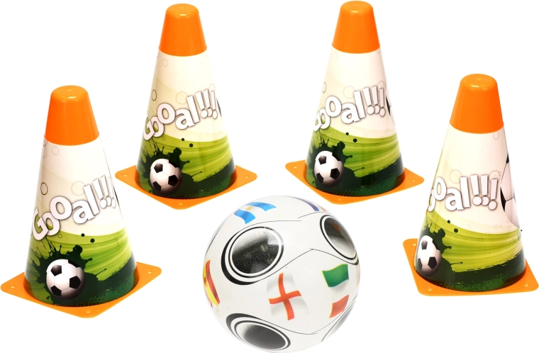 Complete voetbalset voor de kleinste sporters met 4 trainingspionnen (18 cm) en een lichte bal met een diameter van 12 cm. Ideaal voor de ontwikkeling van motoriek, bewegingscoördinatie en de eerste voetbalskills. Dankzij de compacte afmetingen geschikt voor buiten en binnen, en met de praktische netzak eenvoudig te dragen en op te bergen.