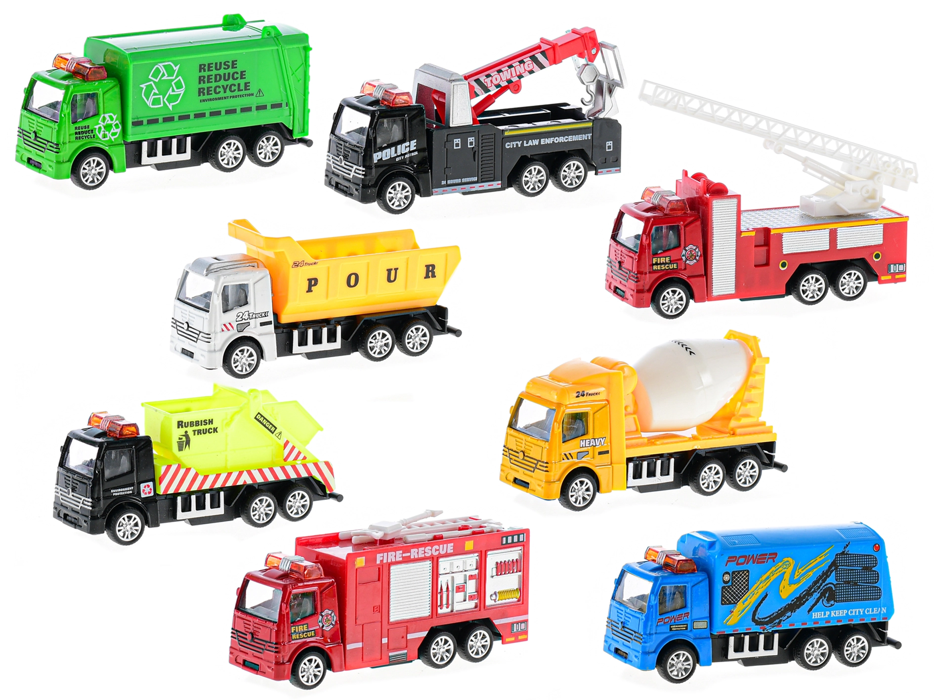 Keuze uit 8 soorten: vuilniswagen, takelwagen, brandweer, kipper, betonmixer en straatreiniger – ideaal om je eigen stad te bouwen.