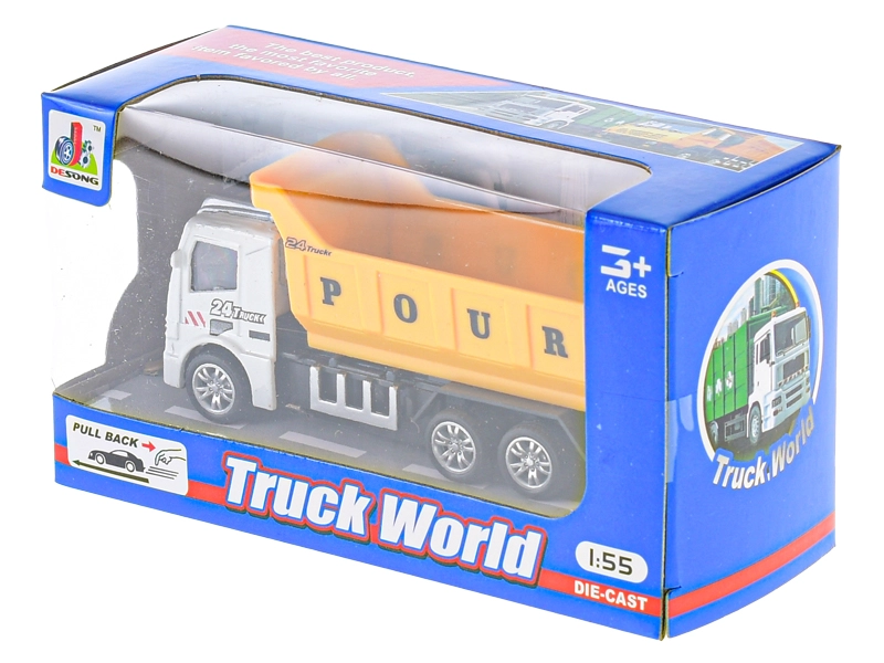 Model van een kiepvrachtwagen in schaal 1:55 met functionele laadbak en zelfstandig rijden na terugtrekken voor nog leuker spel.