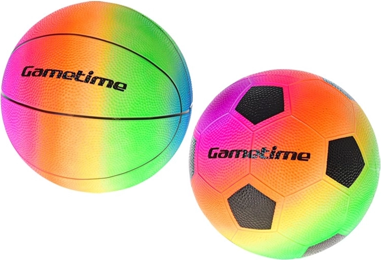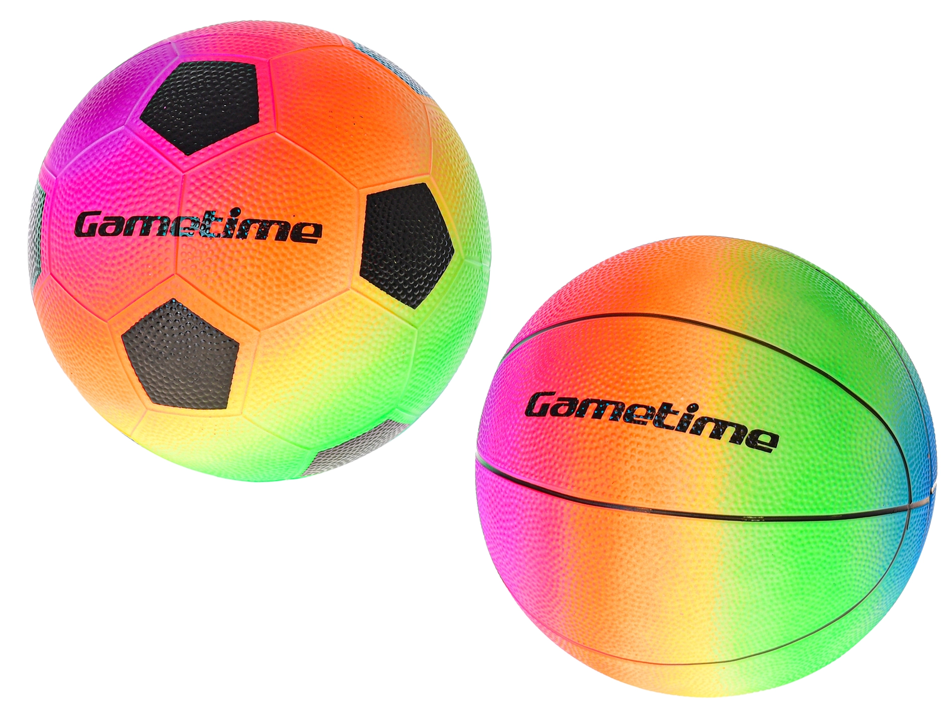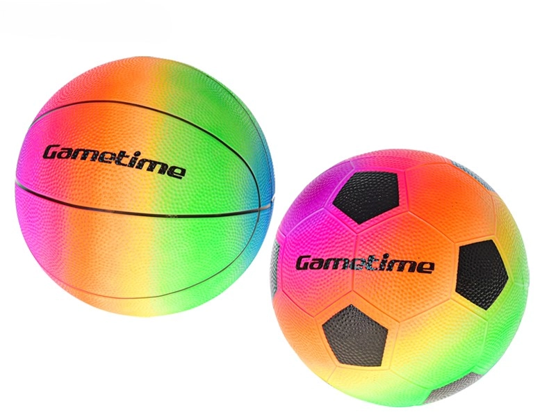 Kies tussen een basketbal- of voetbalvariant in regenbooguitvoering – ideaal voor recreatief spel buiten en bij het water.