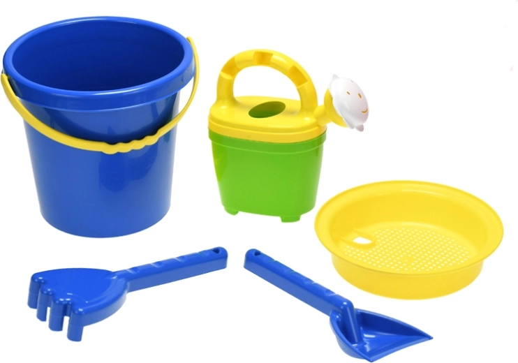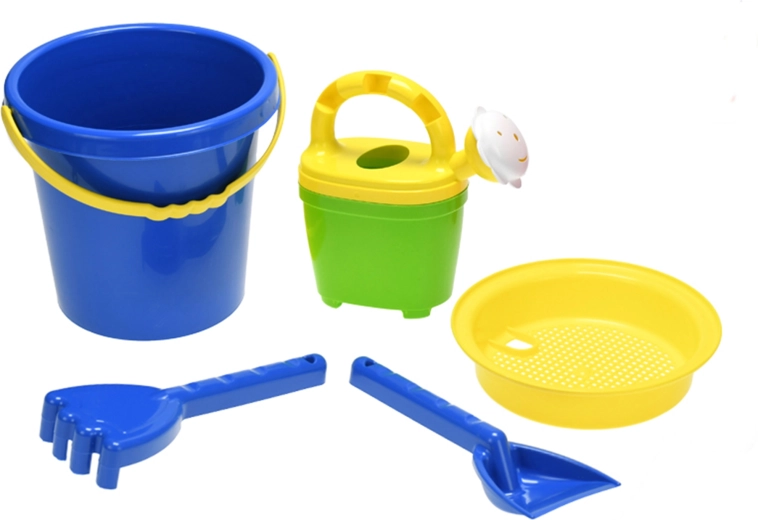 Emmer 17 cm, gietertje 16 cm, zeef, schepje en harkje – alles wat kinderen nodig hebben om zandkastelen te bouwen en met water te spelen op het strand en in de zandbak.