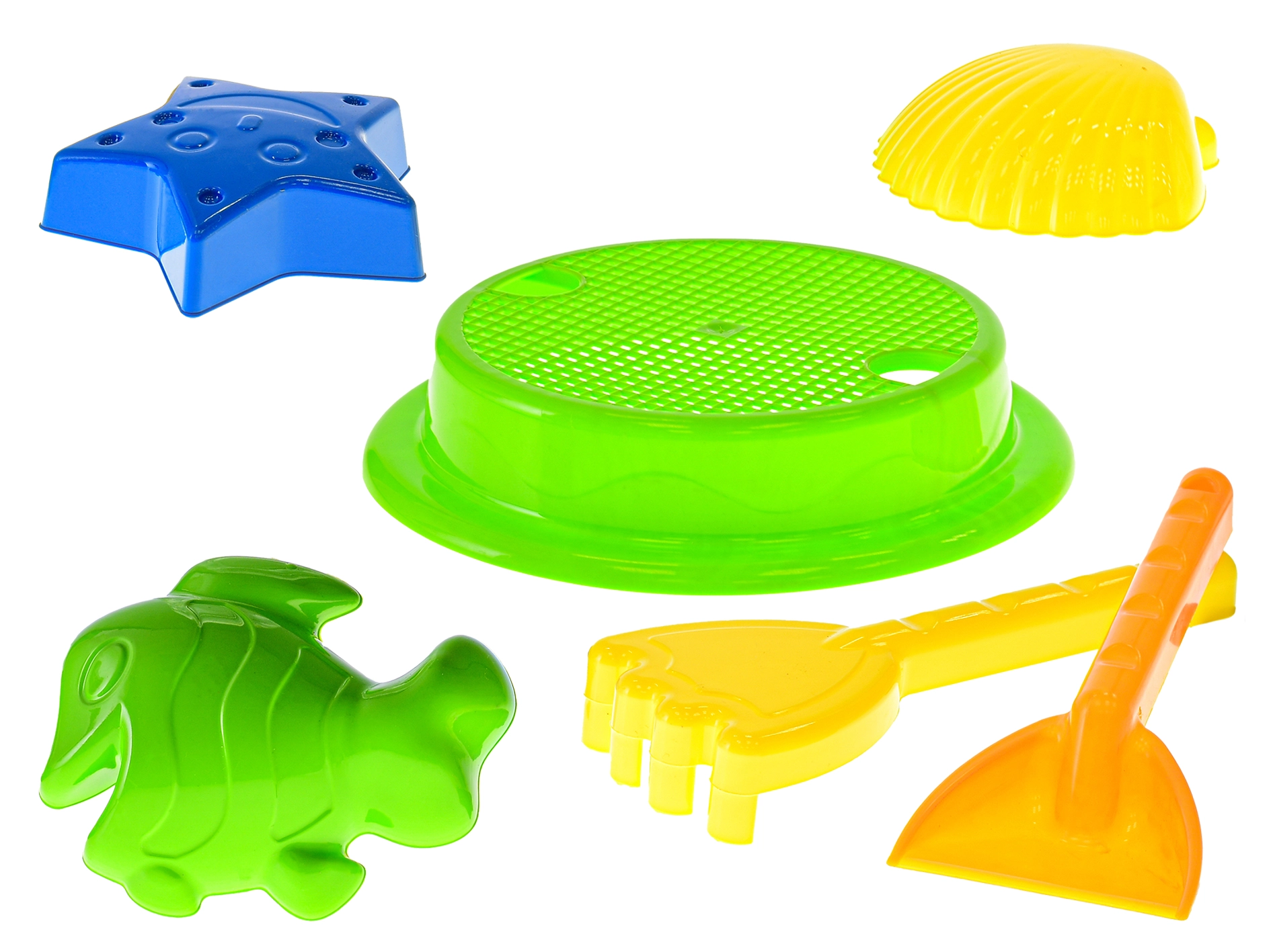 De zeef, schep, hark en 3 vormpjes in heldere kleuren stimuleren kinderen om te ontdekken, bouwen en zand te vormen.