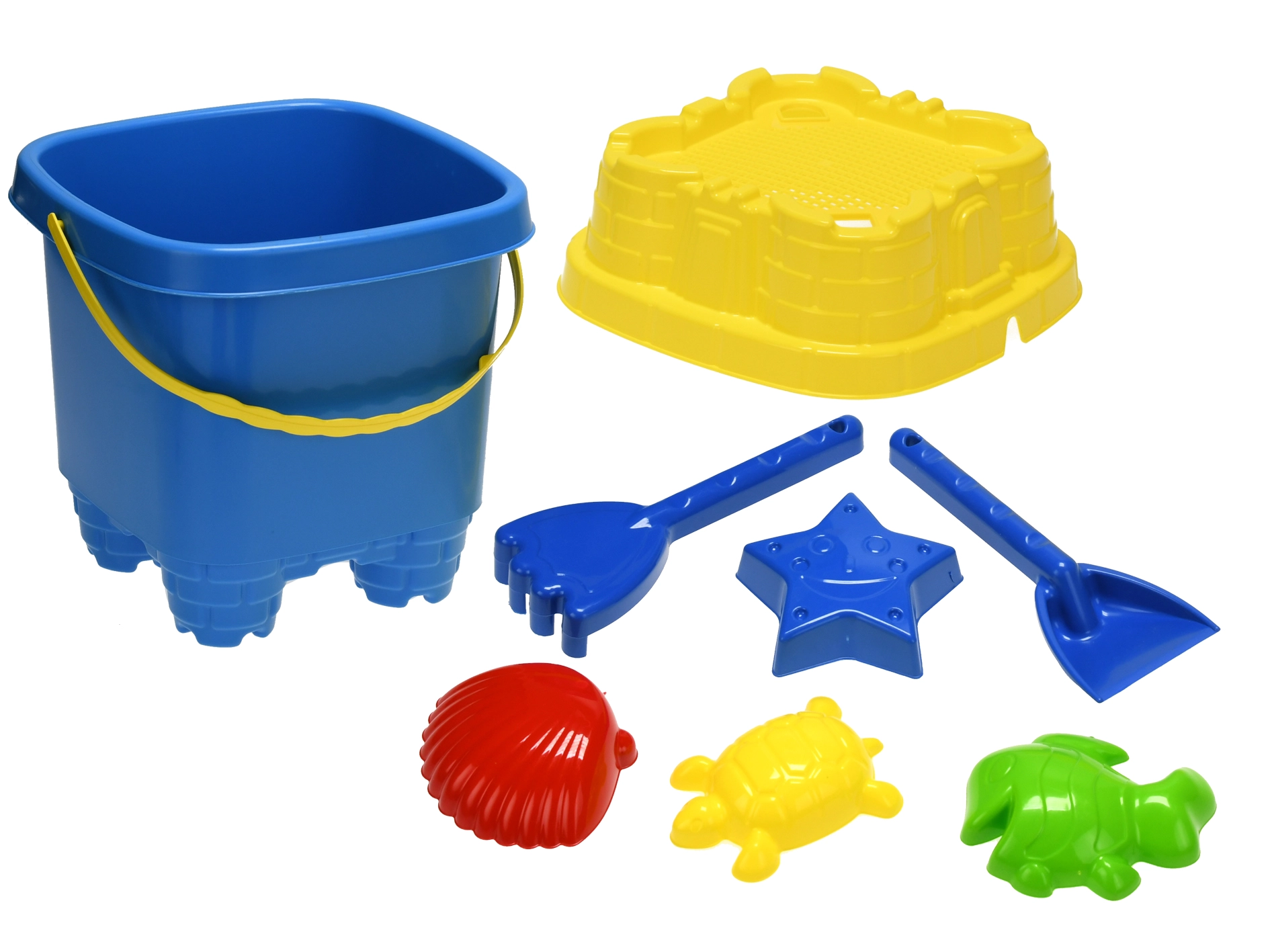 - Complete set: emmer met deksel, schep, harkje en 4 vormpjes (10–11 cm)
