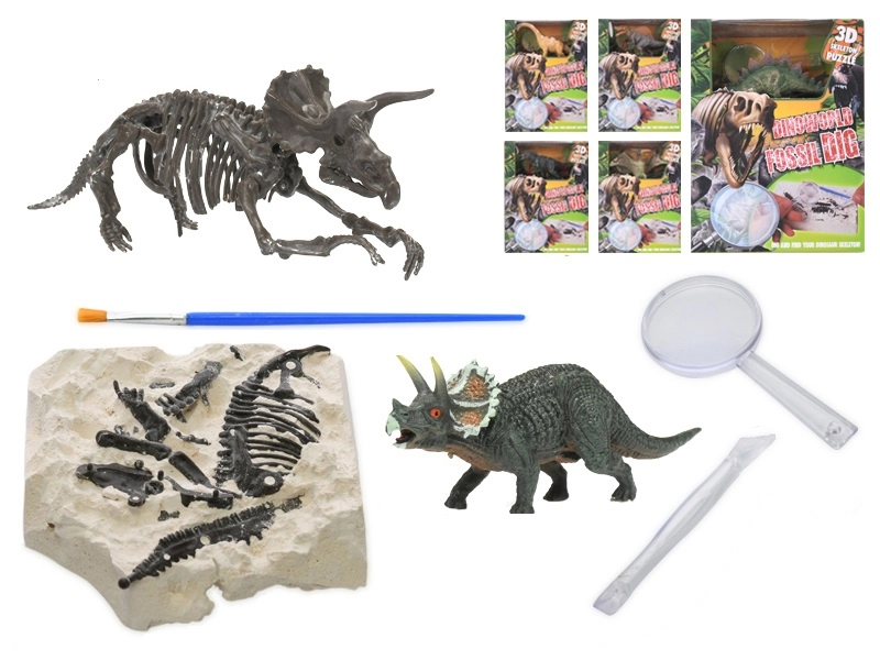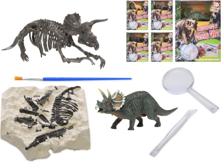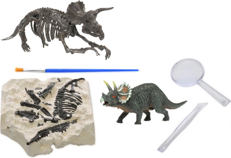 - Complete uitrusting in de verpakking: gipsblok met fossiel, beitel, loep, penseel en dinosaurusfiguur.