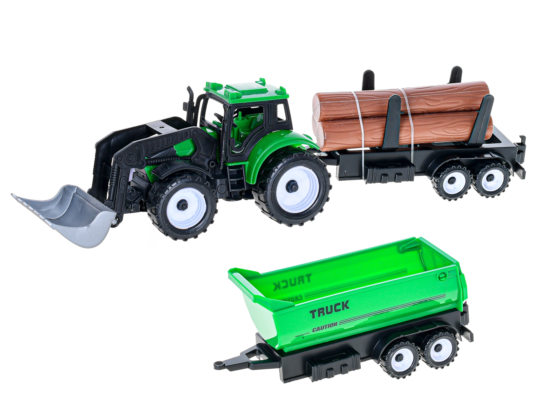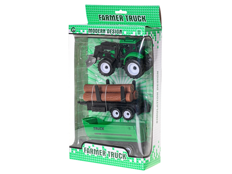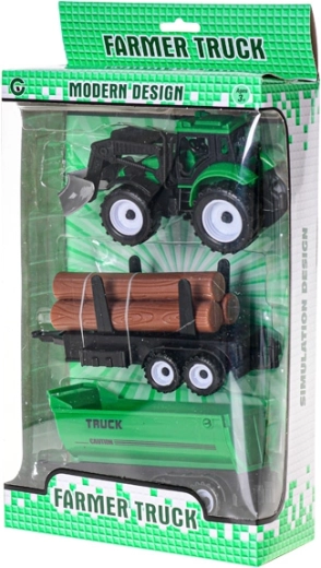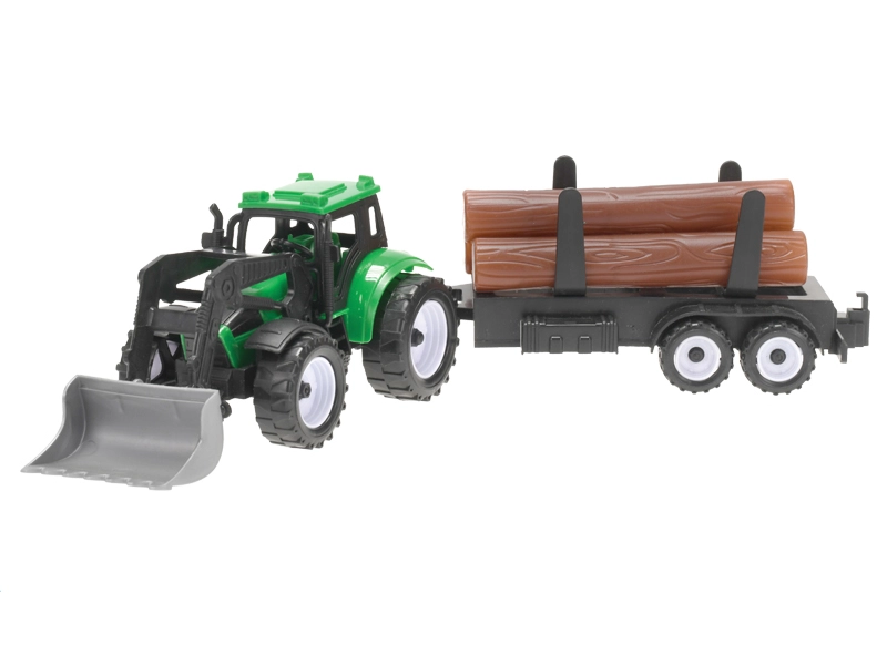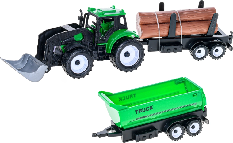 Ontdek plezier op het platteland met de gedetailleerde tractor met voorlader, die dankzij het vliegwiel soepel en lang rijdt. Twee verwisselbare aanhangers – een plattebak voor boomstammen en een kipper – vergroten de speelmogelijkheden van laden tot het kiepen van de lading.
