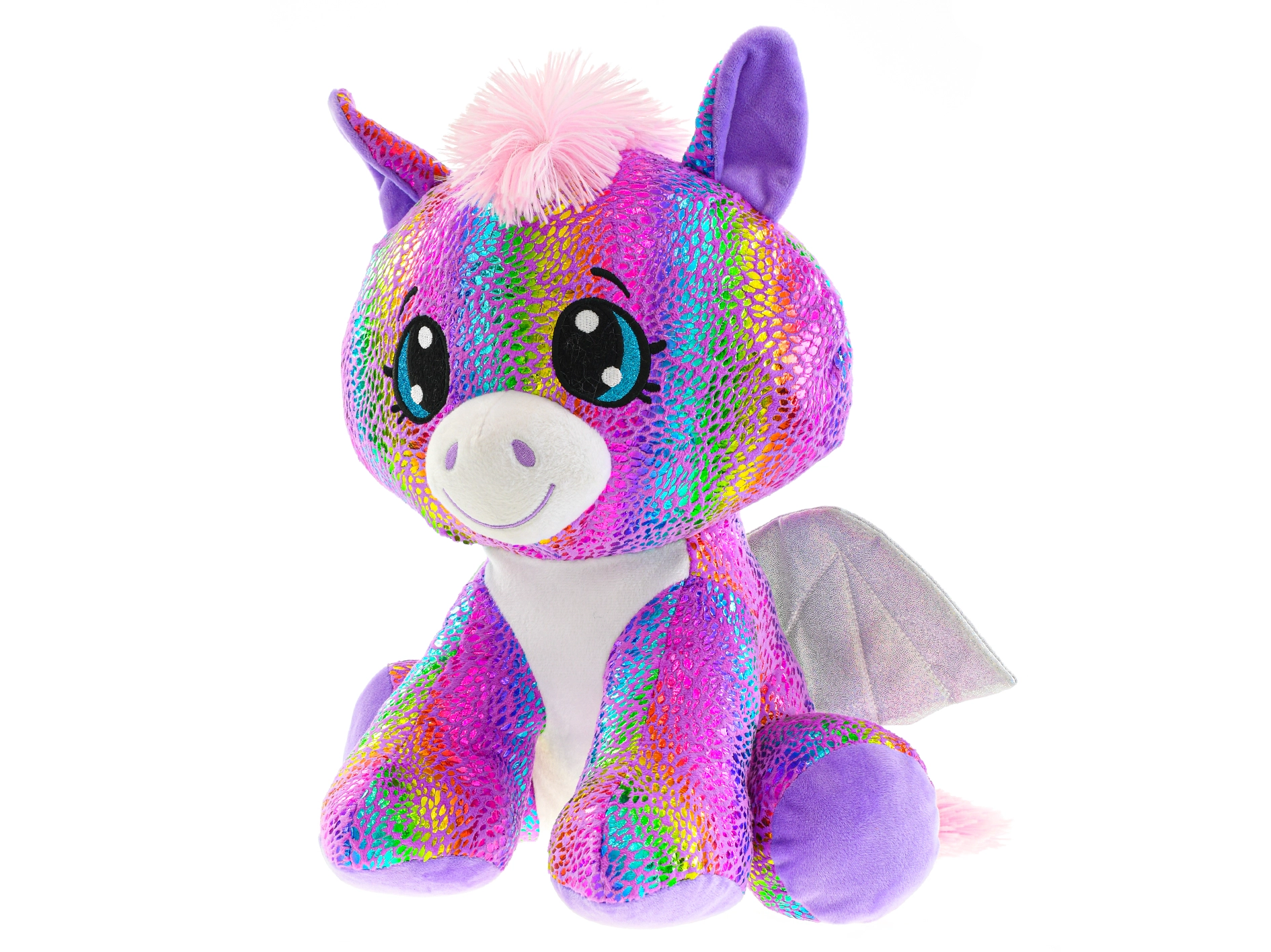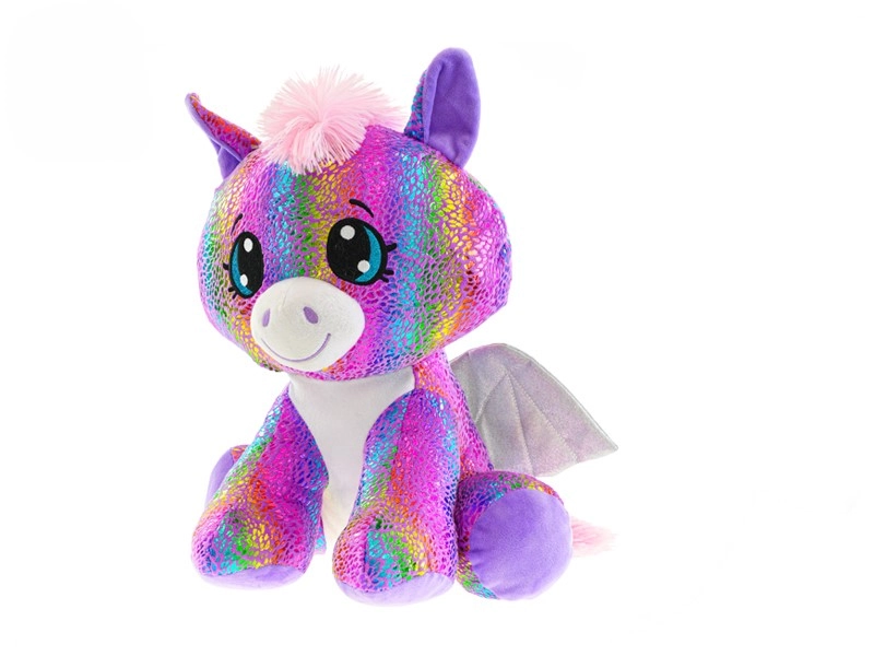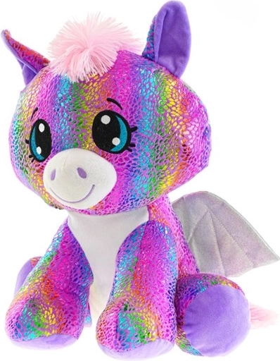 Deze kleurrijke pegas brengt kinderen magie en zachtheid in één. Hij is gemaakt van zachte pluche met glinsterende sterretjes en regenboogeffecten die elke kleine liefhebber van magische wezens zullen betoveren. De zittende vorm zorgt voor stabiliteit en maakt het eenvoudig om hem op een plank of nachtkastje neer te zetten.
