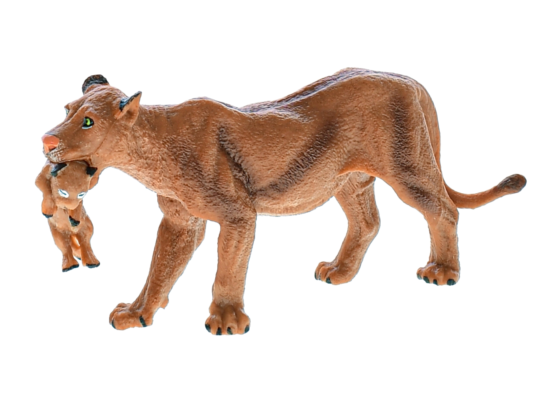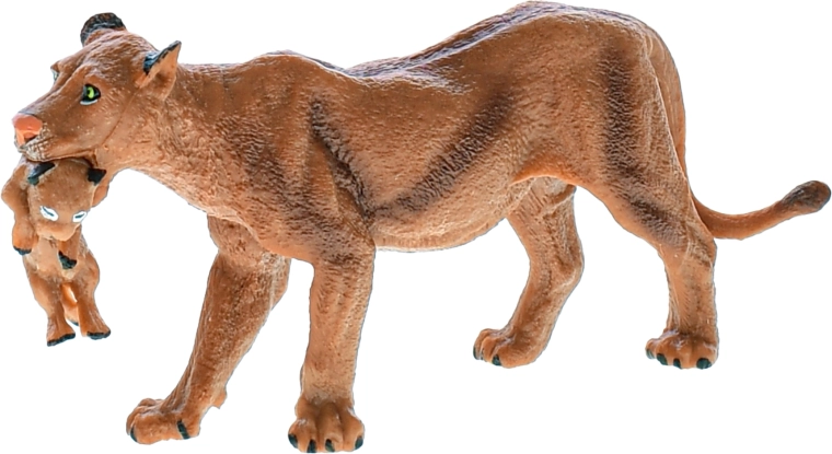 Het figuur is 13 cm groot en wordt geleverd in een praktische doos met afmetingen van 16 × 9,5 × 11 cm, waardoor het gemakkelijk op te bergen en te schenken is. Er kan worden gekozen uit de varianten leeuw of leeuwin met jong, die een geweldige aanvulling vormen op een kinderlijke dierenverzameling.