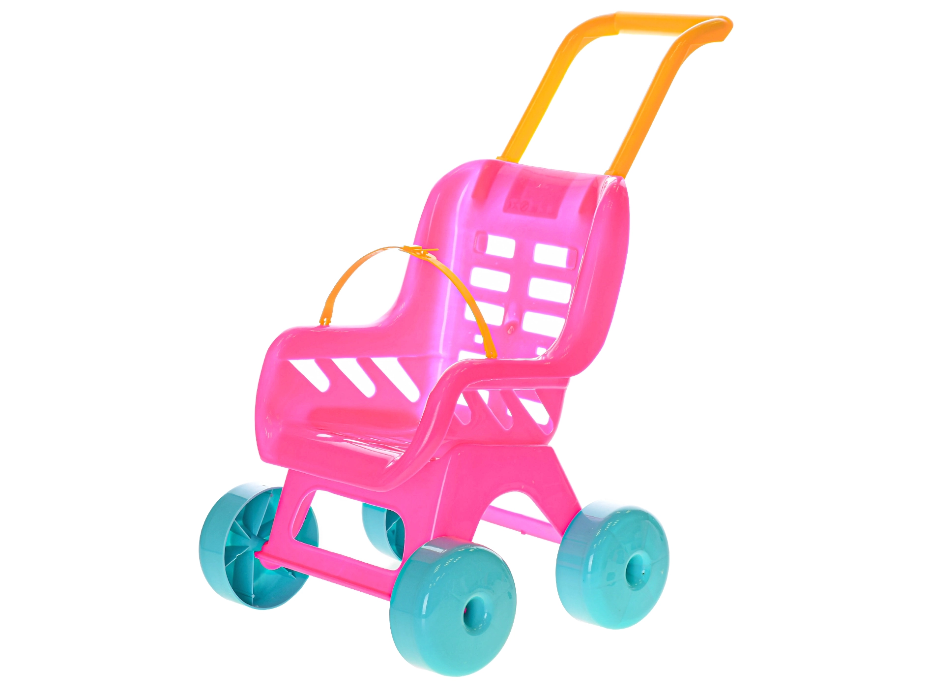 Lichte en duurzame roze poppenwagen Buggy met grote blauwe wielen, ideaal om binnen en buiten mee te spelen. Dankzij het gemakkelijk afwasbare kunststof blijft hij eenvoudig schoon, de stabiele vier wielen zorgen voor veilig rijden en de hoogte van 50 cm is comfortabel voor kinderen vanaf 3 jaar.