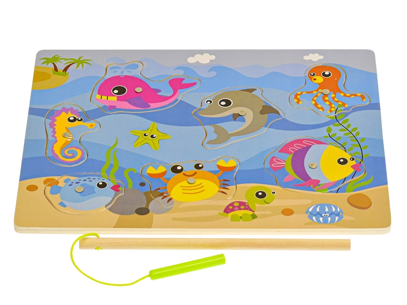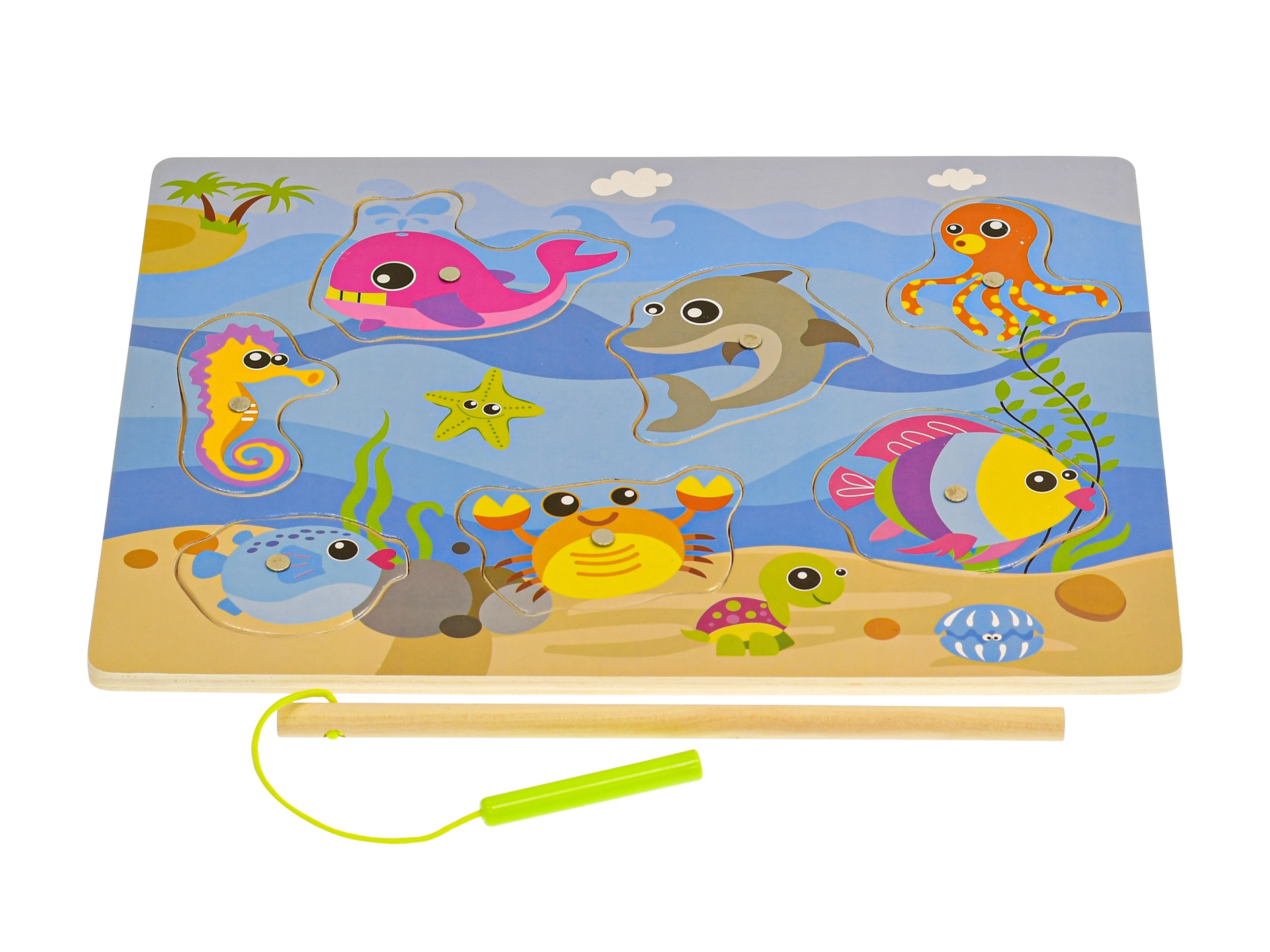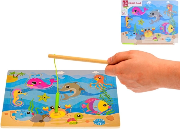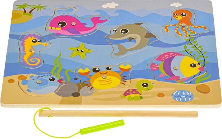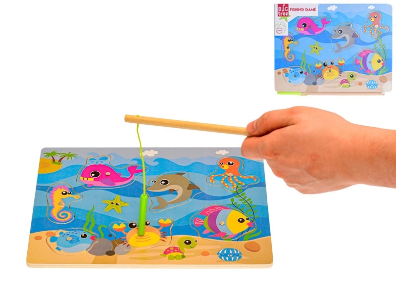 Het houten magnetische spel Vissen van Big Tree biedt twee leuke activiteiten in één: het vangen van visjes met een magnetische hengel en het terugplaatsen van de visjes in de bijpassende openingen op het bord. De hoogwaardige houten afwerking is duurzaam en kindveilig, met een glad oppervlak en prettige kleuren.