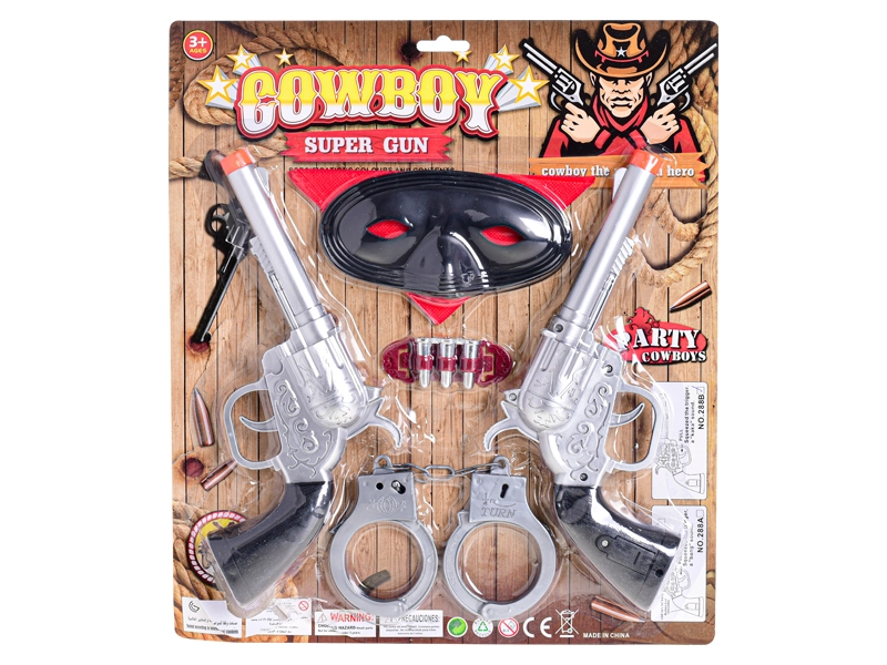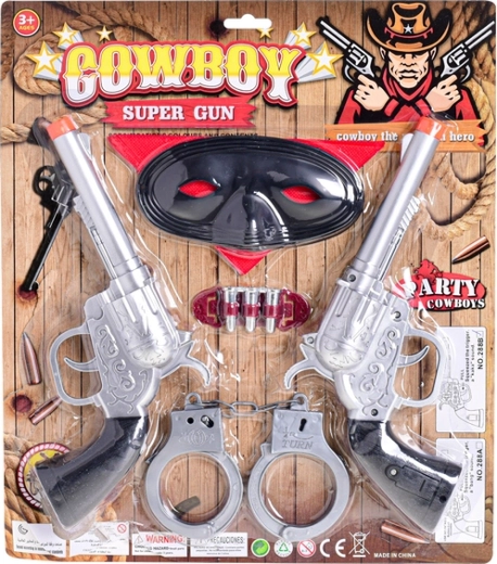 Wat is een cowboy zonder de juiste uitrusting? Met deze set laat je alle boeven zien hoe scherp je schot is en toon je je vaardigheden in het Wilde Westen. De twee pistolen maken het mogelijk om samen met een vriend te spelen of afwisselend de rol van sheriff en bandiet op je te nemen; het masker zorgt voor mysterie en de handboeien brengen actiescènes tot leven.