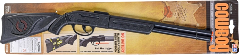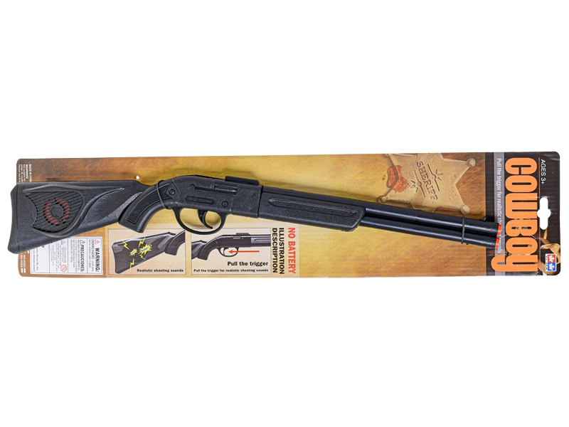 Geef kinderen een vleugje Wilde Westen met dit cowboy klappergeweer van 50 cm. Een licht en makkelijk te hanteren speeltje van duurzaam kunststof in zwarte kleur dat bij het overhalen van de trekker een authentiek klappergeluid maakt, wat het rollenspel als cowboy versterkt. Geschikt vanaf 3 jaar, praktisch op kaart verpakt.