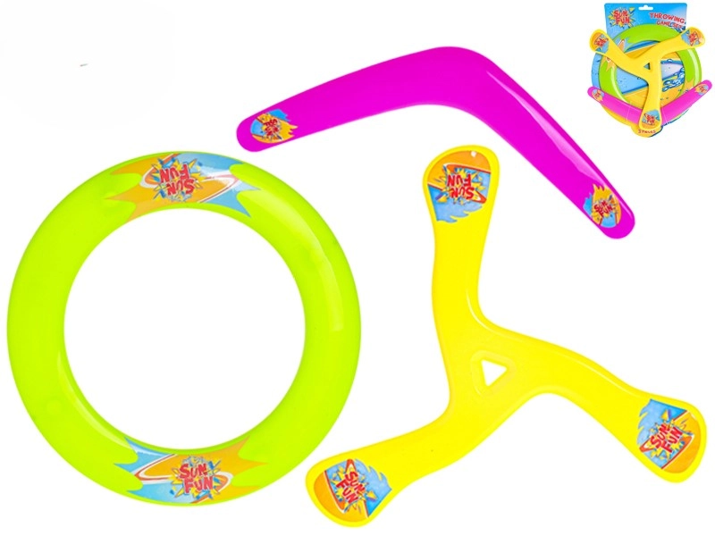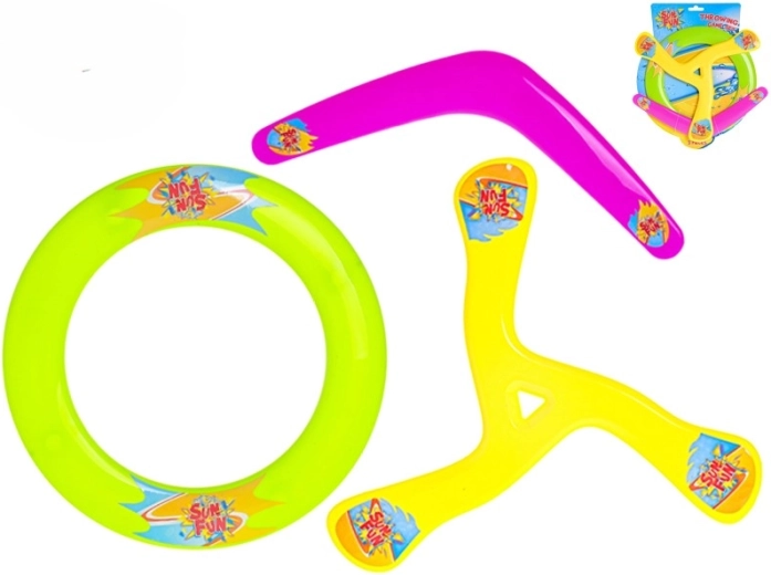 De set vliegende schijven SUN FUN is een uitstekende keuze voor actieve buitenspellen. Met drie verschillende typen schijven vindt iedereen een stijl die past – van stabiele, lange worpen met de ringvormige schijf, via de klassieke frisbee tot de speelse uitdaging van de boemerang. Heldere neonkleuren verhogen de zichtbaarheid tijdens de vlucht en ondersteunen veiliger spel.