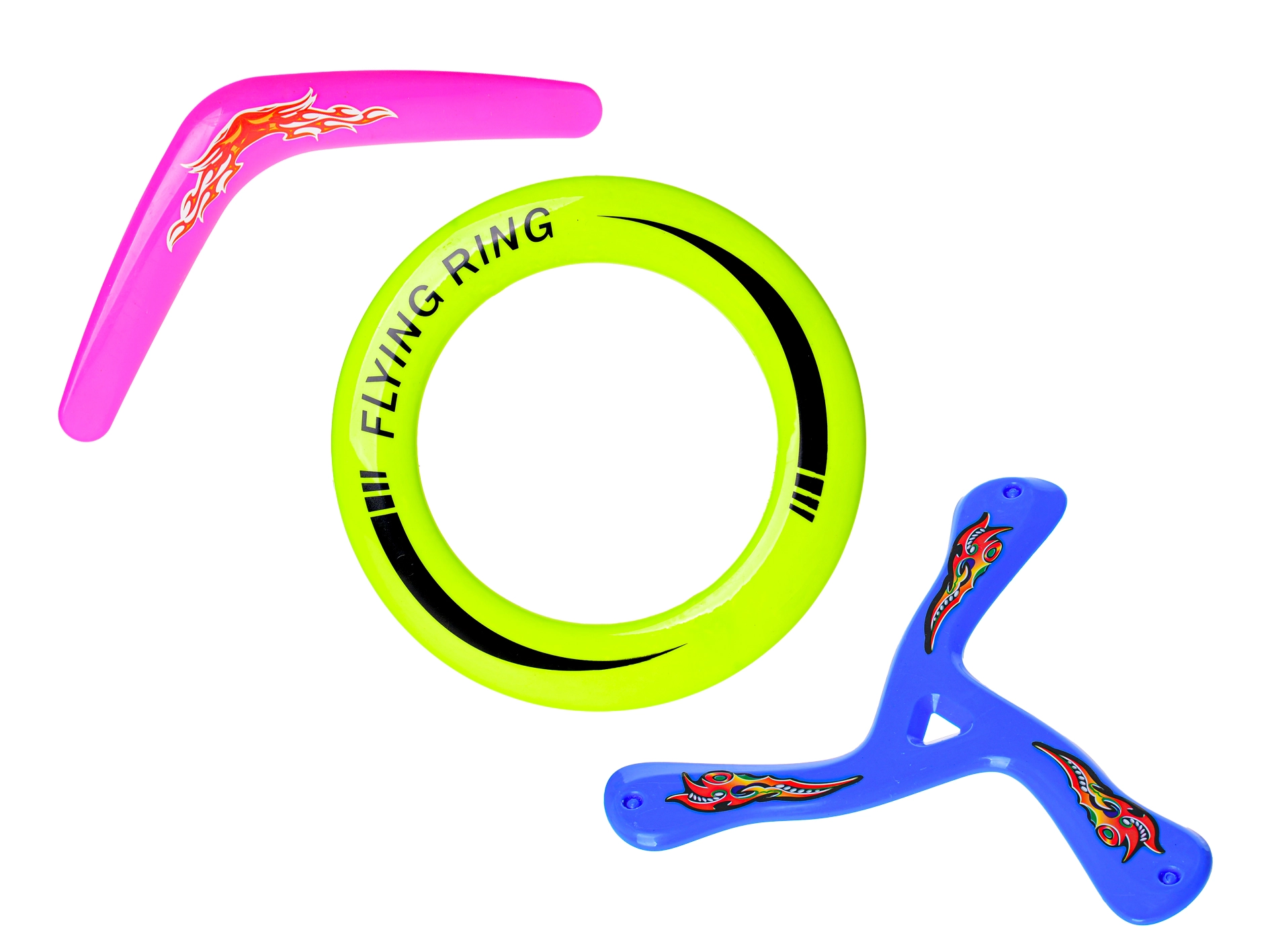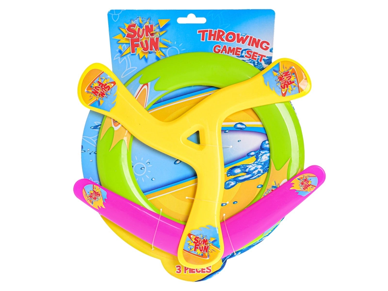 In de verpakking vind je drie verschillende soorten vliegspeelgoed – een klassieke frisbee, een ringvormige schijf en een boemerang. Elk onderdeel biedt een eigen speel- en trainingsstijl.