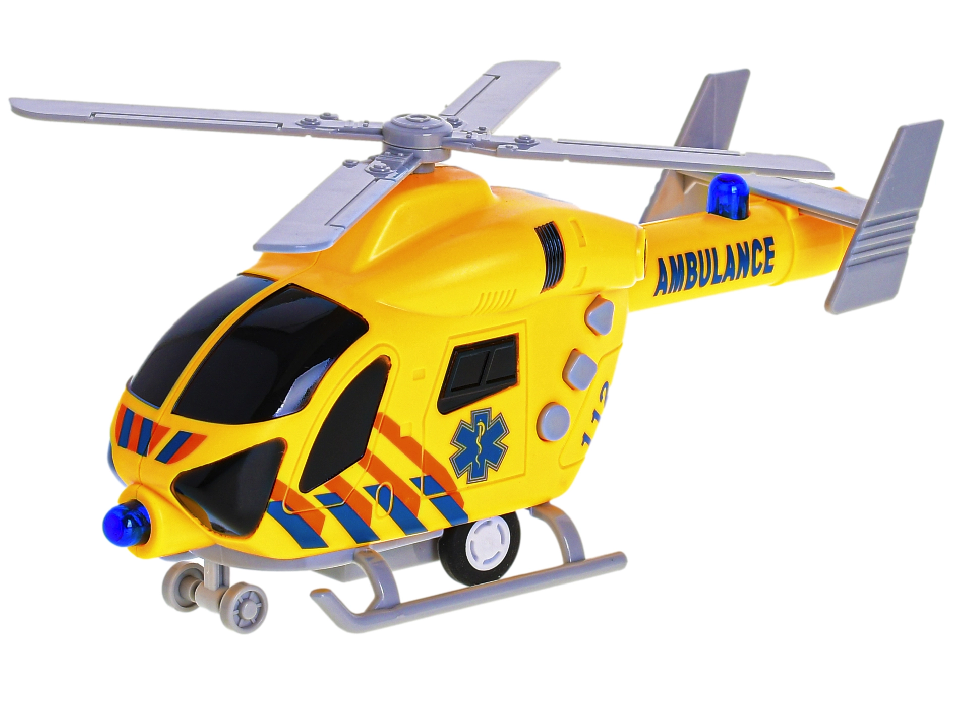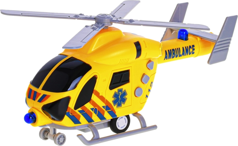Deze kunststof reddingshelikopter biedt kinderen een authentieke ervaring van reddingsmissies. Dankzij de frictieaandrijving rijdt hij eenvoudig weg met één beweging en de realistische licht- en geluidseffecten versterken de spelbeleving. De gele uitvoering met de opvallende tekst “ambulance” trekt meteen de aandacht en stimuleert de kinderlijke fantasie.