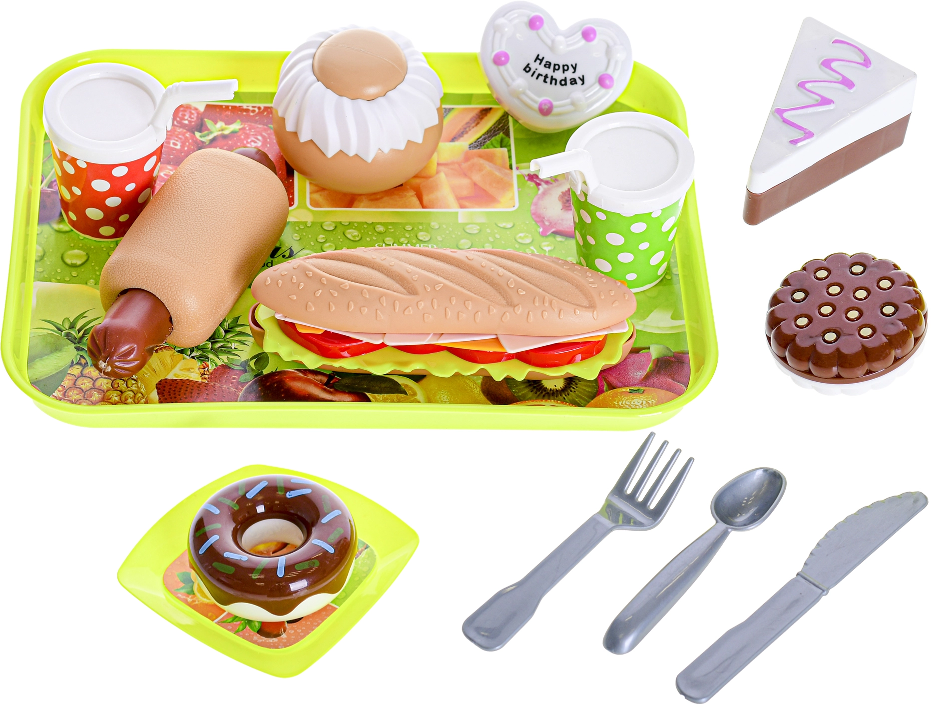 Een leuke set voor kleine koks met in totaal 21 onderdelen brengt de wereld van fastfood direct naar de kinderkamer. Kinderen genieten van het bereiden van een hamburger, friet en drankjes, terwijl ze hun creativiteit en fijne motoriek ontwikkelen. Veilig hoogwaardig plastic is gemakkelijk schoon te maken en de compacte afmetingen garanderen plezier thuis en onderweg.