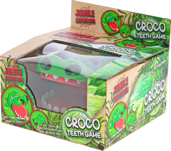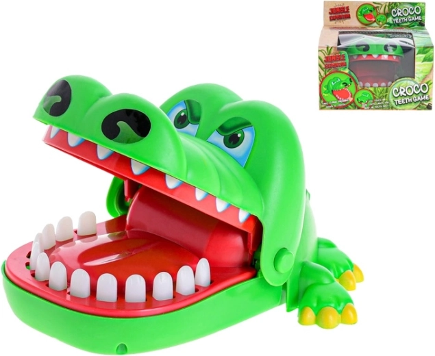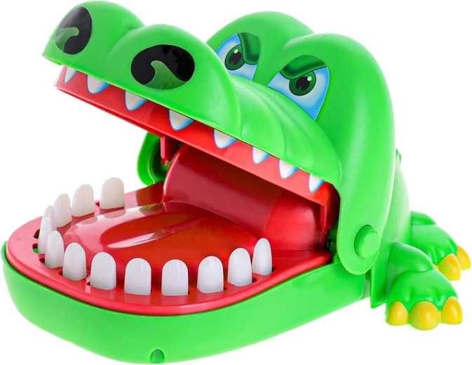 De vrolijke groene krokodil met openklappende bek brengt spanning in elk spel. Spelers kiezen om de beurt een tand en drukken deze zachtjes in – één ervan activeert het onmiddellijke dichtklappen van de bek, wat iedereen verrast en aan het lachen maakt.