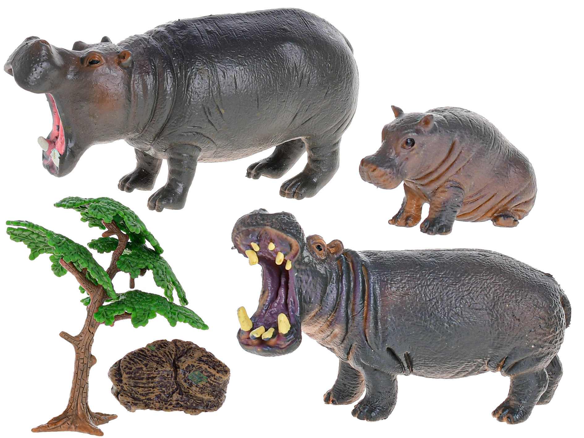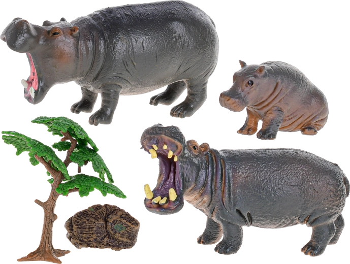 Figuren van mannetjesnijlpaard, vrouwtje, jong en accessoires