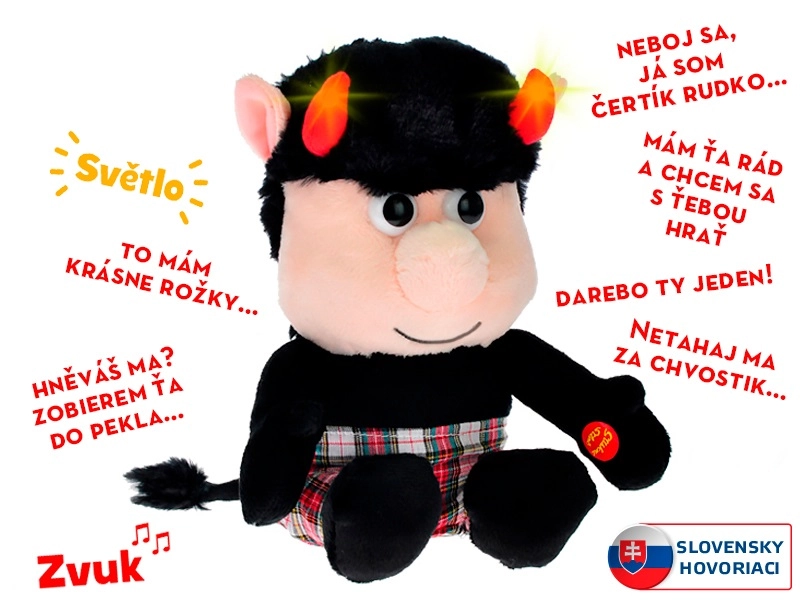 Het schattige duiveltje Rudko maakt jong en oud blij. Hij is gemaakt van zachte pluche en vermaakt je bij het indrukken van zijn hand met Slowaakse zinnetjes, terwijl zijn lichtgevende hoorns knipperen. De compacte hoogte van 20 cm is ideaal om te knuffelen en mee te spelen, en batterijen zijn inbegrepen.