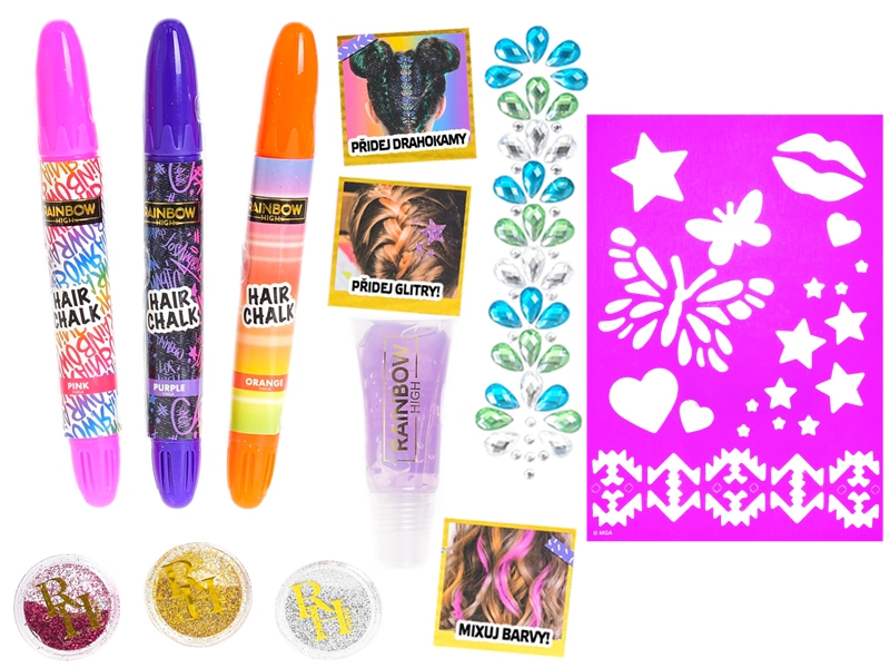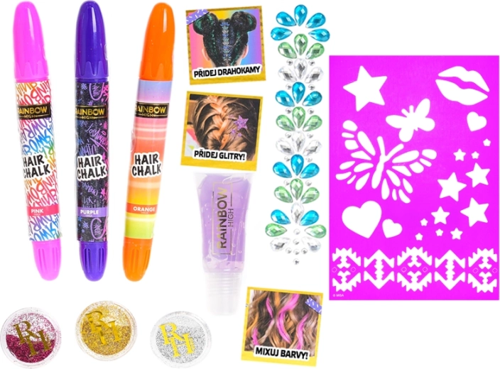 Verlicht elke dag met de creatieve set RAINBOW HIGH! Deze decoratieve haarset biedt gemakkelijke en leuke stylingopties voor kleine modeliefhebbers. Bevat haarkrijtjes, steentjes, sjablonen, gel en glitter voor een snelle haartransformatie zonder blijvende veranderingen – ideaal als verjaardagscadeau of voor een bijzondere gelegenheid.