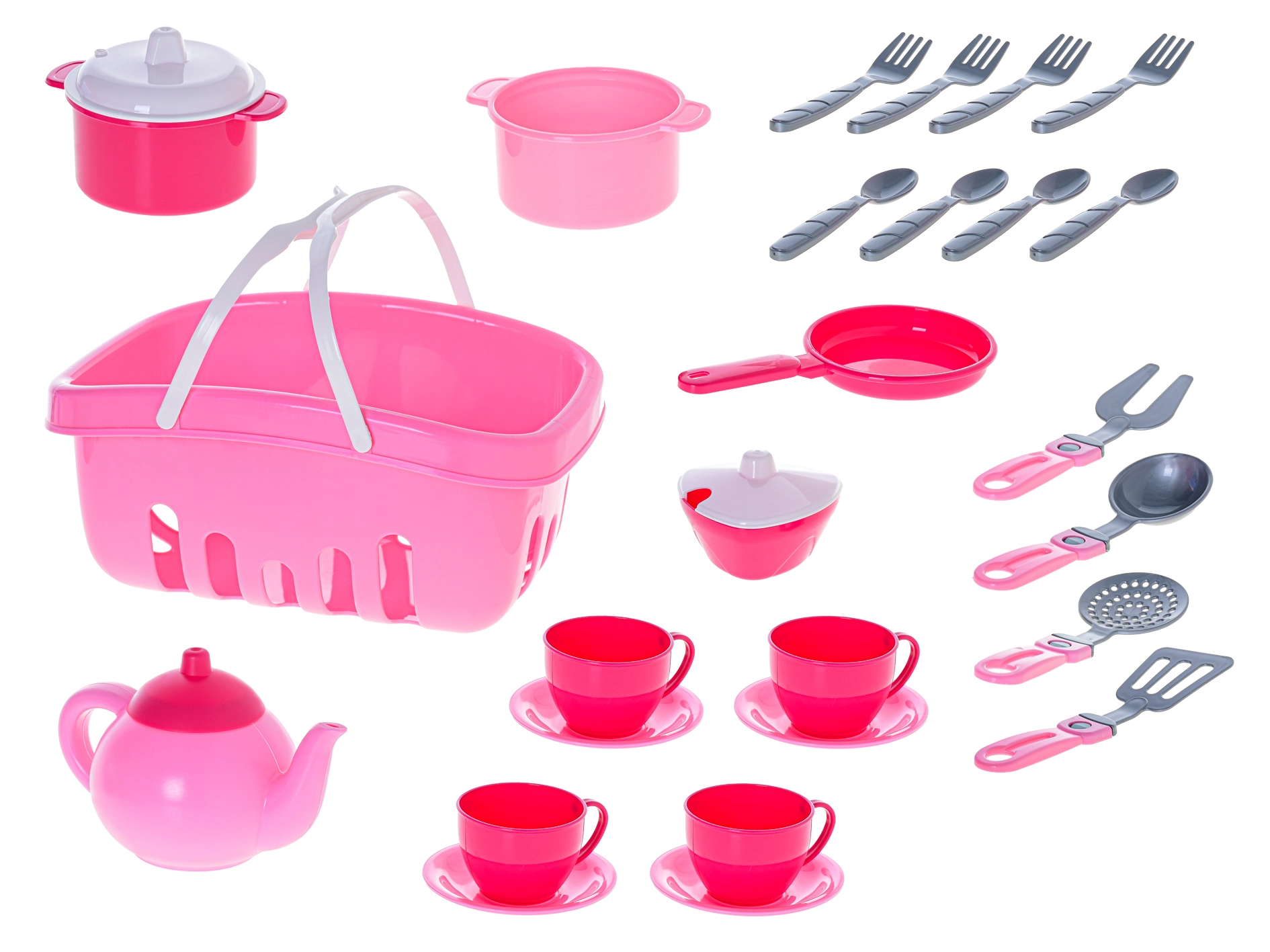 Complete 26-delige set: theepot, pannen, koekenpan, kopjes met schoteltjes, bestek en keukengerei voor uren speelplezier.