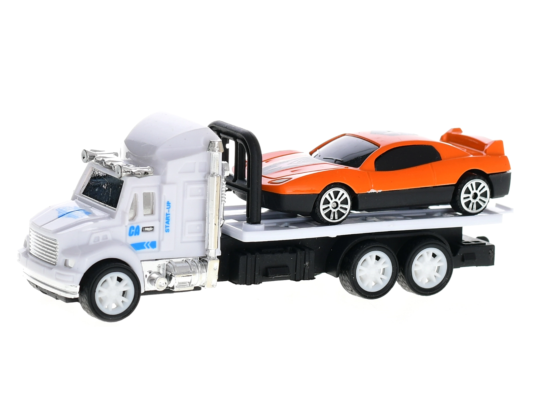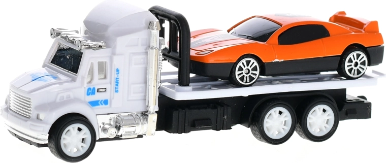 Leuke vrachtwagen met vliegwielaandrijving van 12,5 cm met een kleiner voertuig op het platform – perfect voor kleine chauffeurs. Hoogwaardige kunststof, drie kleurvarianten en geen batterijen nodig zorgen voor urenlang speels plezier en stimuleren de creativiteit.
