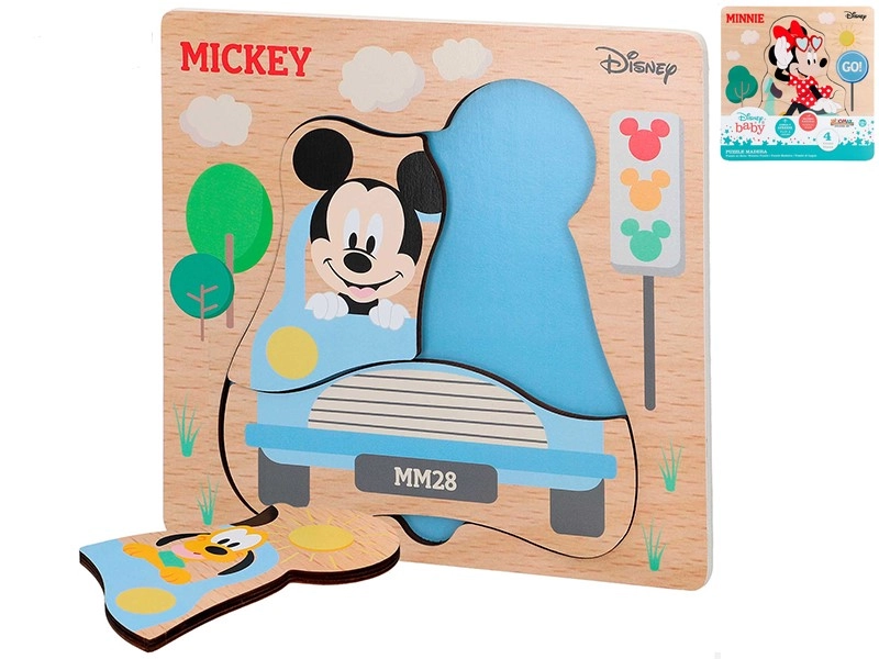 Schattige houten puzzel met motieven van DISNEY Mickey en Minnie, ideaal als eerste puzzel voor kinderen vanaf 12 maanden. Bevat 4 grote stukjes voor makkelijke grip, ondersteunt fijne motoriek, oog-handcoördinatie en het leren van vormen en kleuren. Gemaakt van natuurlijk, duurzaam hout voor veilig en langdurig speelplezier. Het motief wordt willekeurig geleverd afhankelijk van de voorraad.