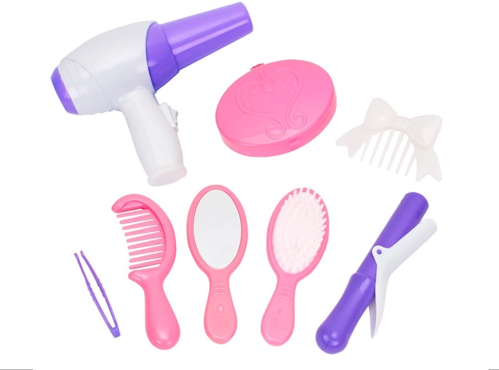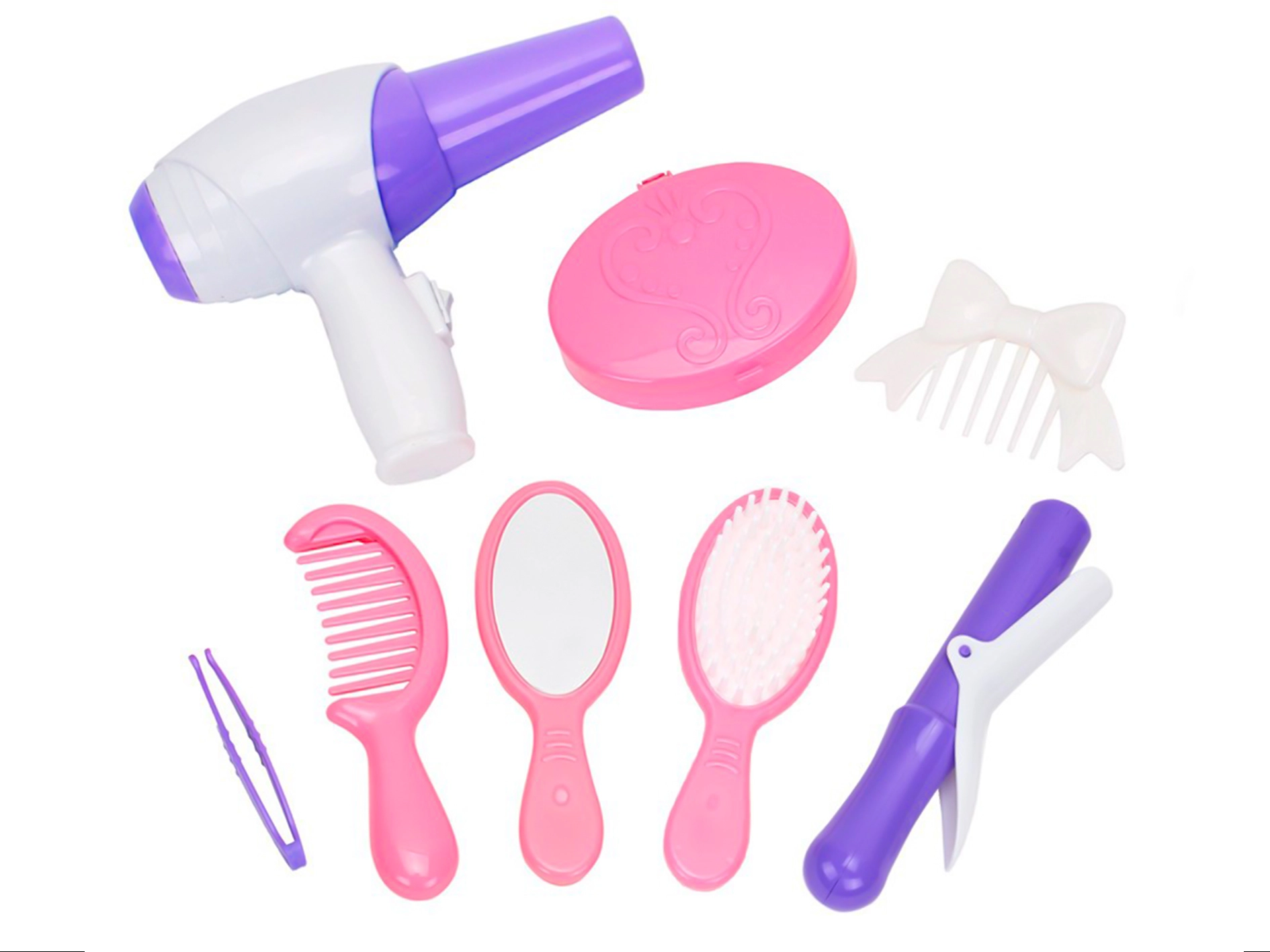 - Föhn, krultang, kam, borstel, spiegeltje, kammetje met strik, poederdoosje, pincet