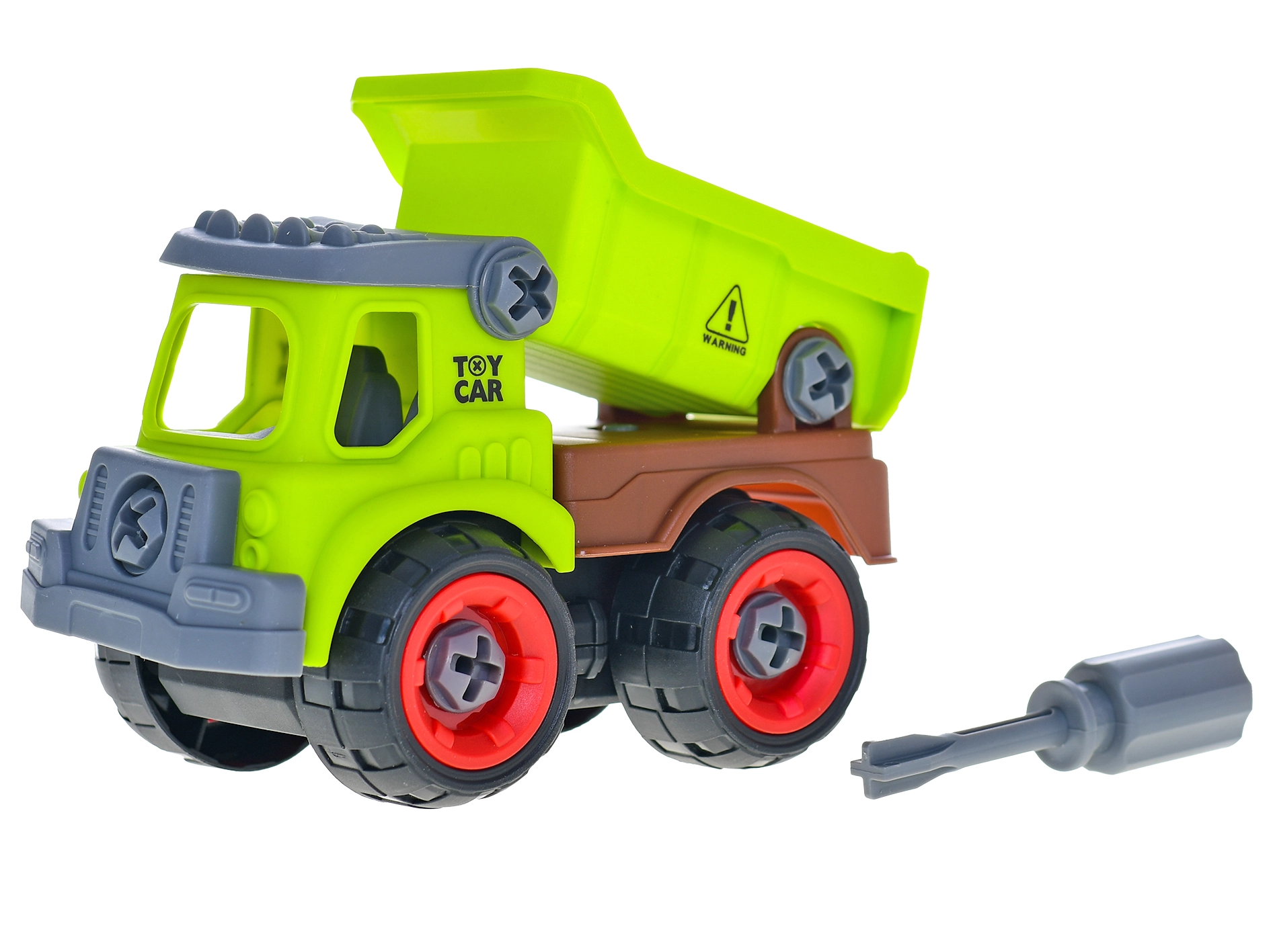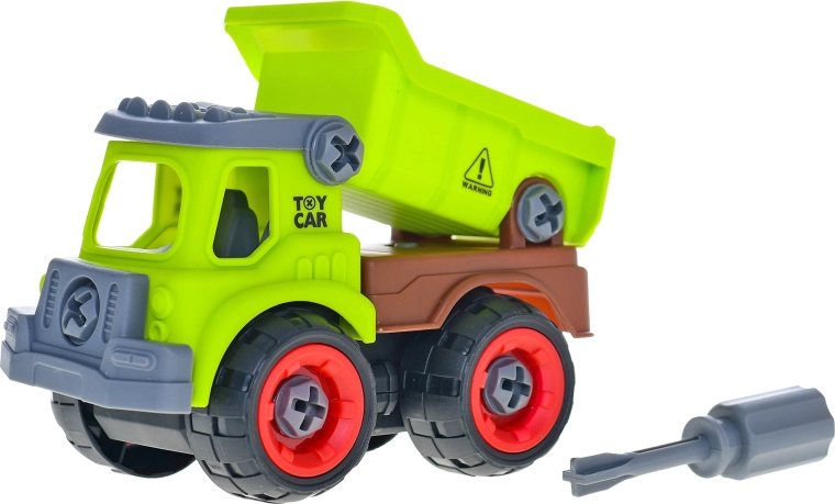 Ontdek de leuke schroefbare kiepwagen voor kleine doe-het-zelvers! De kunststof vrachtwagen van 14 cm wordt geleverd met een schroevendraaier, zodat kinderen het voertuig eenvoudig uit elkaar kunnen halen en weer in elkaar kunnen zetten. Bevordert de fijne motoriek, technisch denken en dankzij de freewheel-functie rijdt hij zonder batterijen. Verkrijgbaar in twee kleurvarianten van de laadbak – groen en bruin, geschikt voor kinderen vanaf 3 jaar.