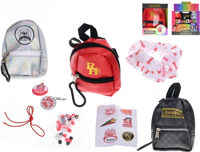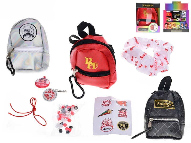 - mini-rugzakje, haarelastiek, gekleurde kralen, hangers met het RAINBOW HIGH-logo