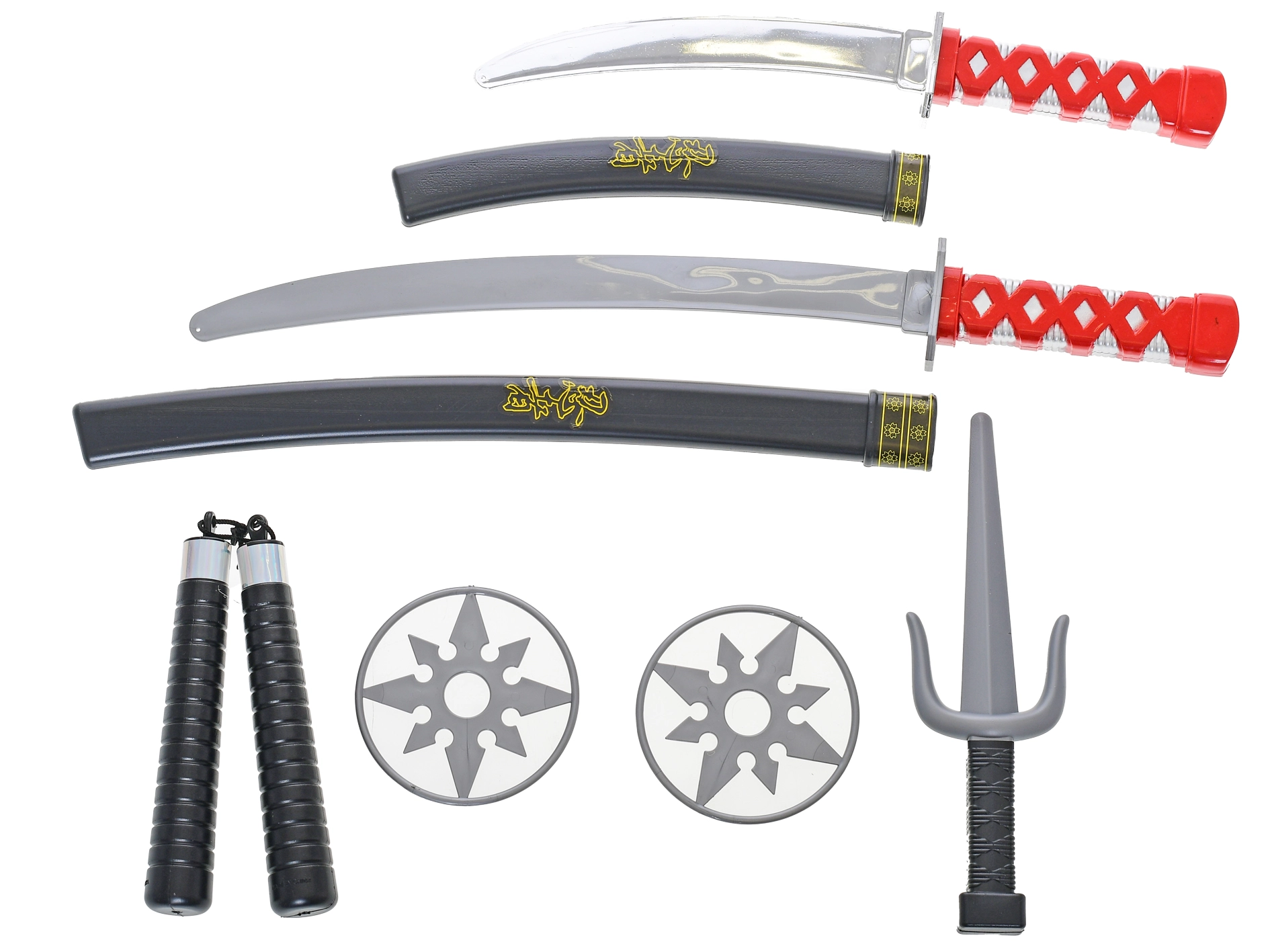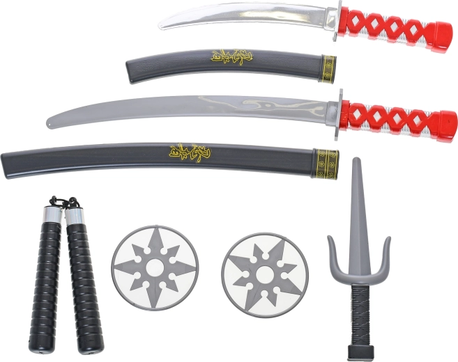 - Complete uitrusting voor ninjaspellen – 2 zwaarden met schede, dolk, nunchaku en 2 werpsterren