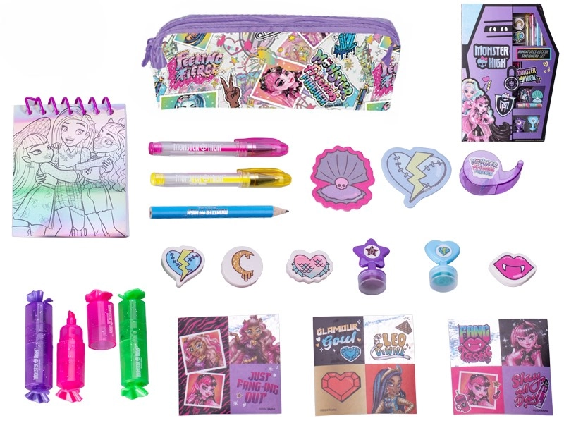 Ontdek een leuke set voor jonge makers – een praktisch etui met MONSTER HIGH-thema, dat alles bevat wat nodig is voor schoolse en vrijetijdse creativiteit. Kinderen zullen houden van het brede kleurenpalet en de mogelijkheid om hun eigen stijl uit te drukken met stickers van hun favoriete personages.