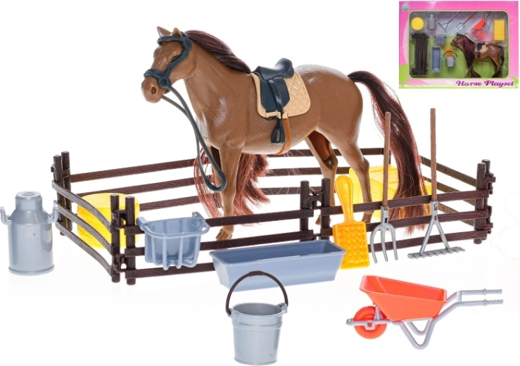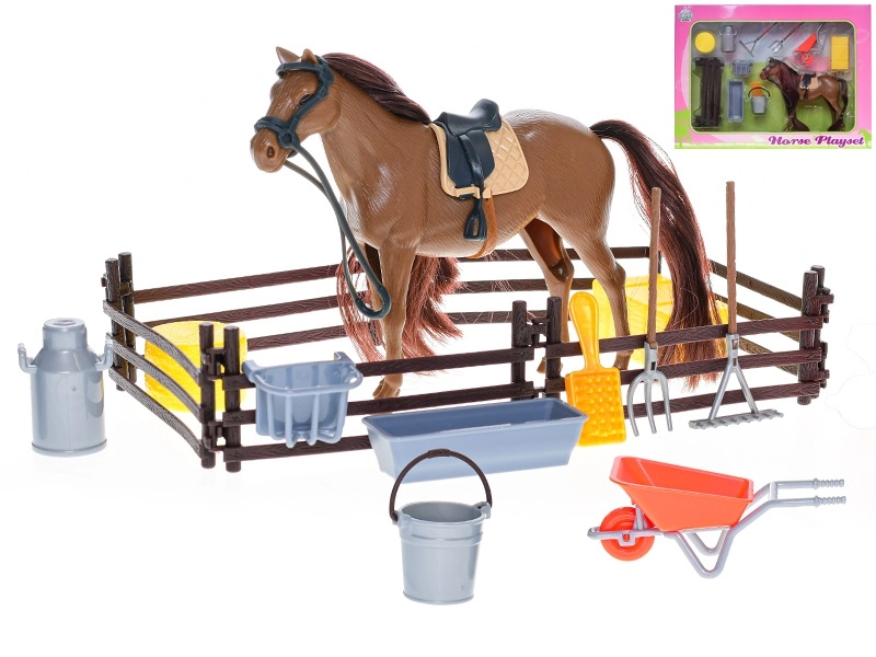 Realistisch uitgewerkte set Kids Globe paard 18 cm zal alle kleine paardenliefhebbers blij maken. In de verpakking zitten praktische verzorgingsaccessoires – een voerbak, borstel en omheining – waarmee kinderen de paardenverzorging levensecht kunnen nabootsen. Het duurzame kunststof materiaal zorgt voor een lange levensduur van het speelgoed en stimuleert de fantasie en fijne motoriek.