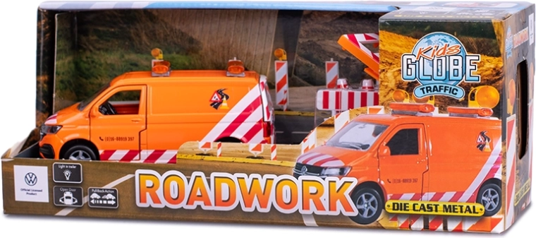 Realistisch metalen model van de VW Transporter van Kids Globe Traffic met een lengte van 27 cm biedt kinderen interactief speelplezier met pull-back, lichteffecten en geluidseffecten. Duurzame uitvoering met kunststof details, geschikt voor kinderen vanaf 3 jaar, geleverd in een praktische doos.