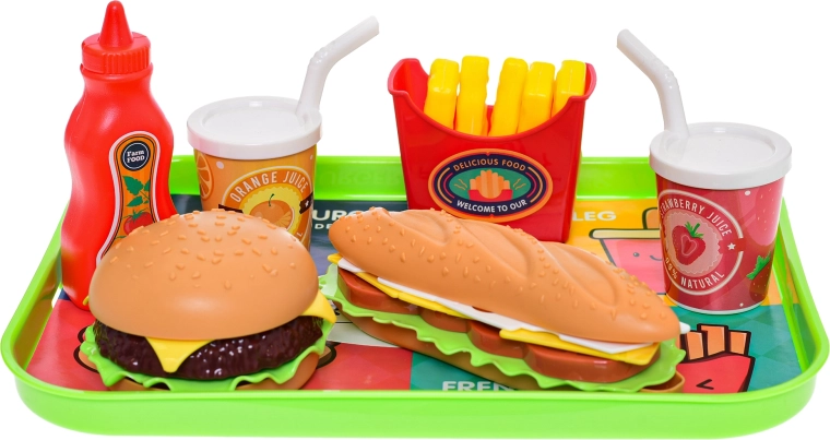 Leuk speelgoed voor kleine koks: deze fastfoodset bevat 6 realistische etenswaren en drankjes op een praktisch dienblad van 26 × 19 cm. Stimuleert fijne motoriek, creativiteit en sociale vaardigheden tijdens rollenspellen zoals restaurant of snackbar. Gemaakt van hoogwaardige kunststof, geschikt voor kinderen vanaf 3 jaar.