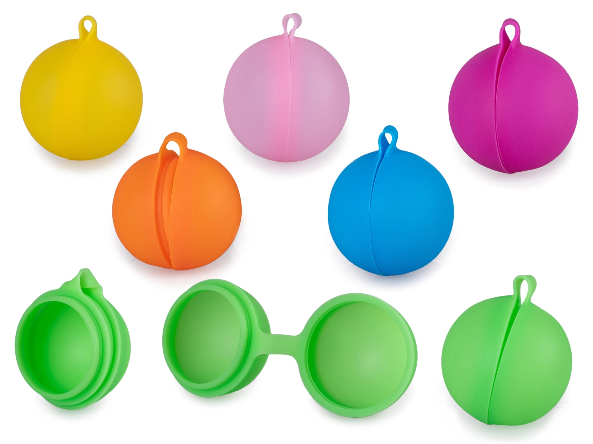 De set bevat 6 kleurrijke ballen (blauw, paars, roze, groen, oranje en geel) die elk waterspel in de tuin, bij het zwembad of op het strand nog leuker maken.