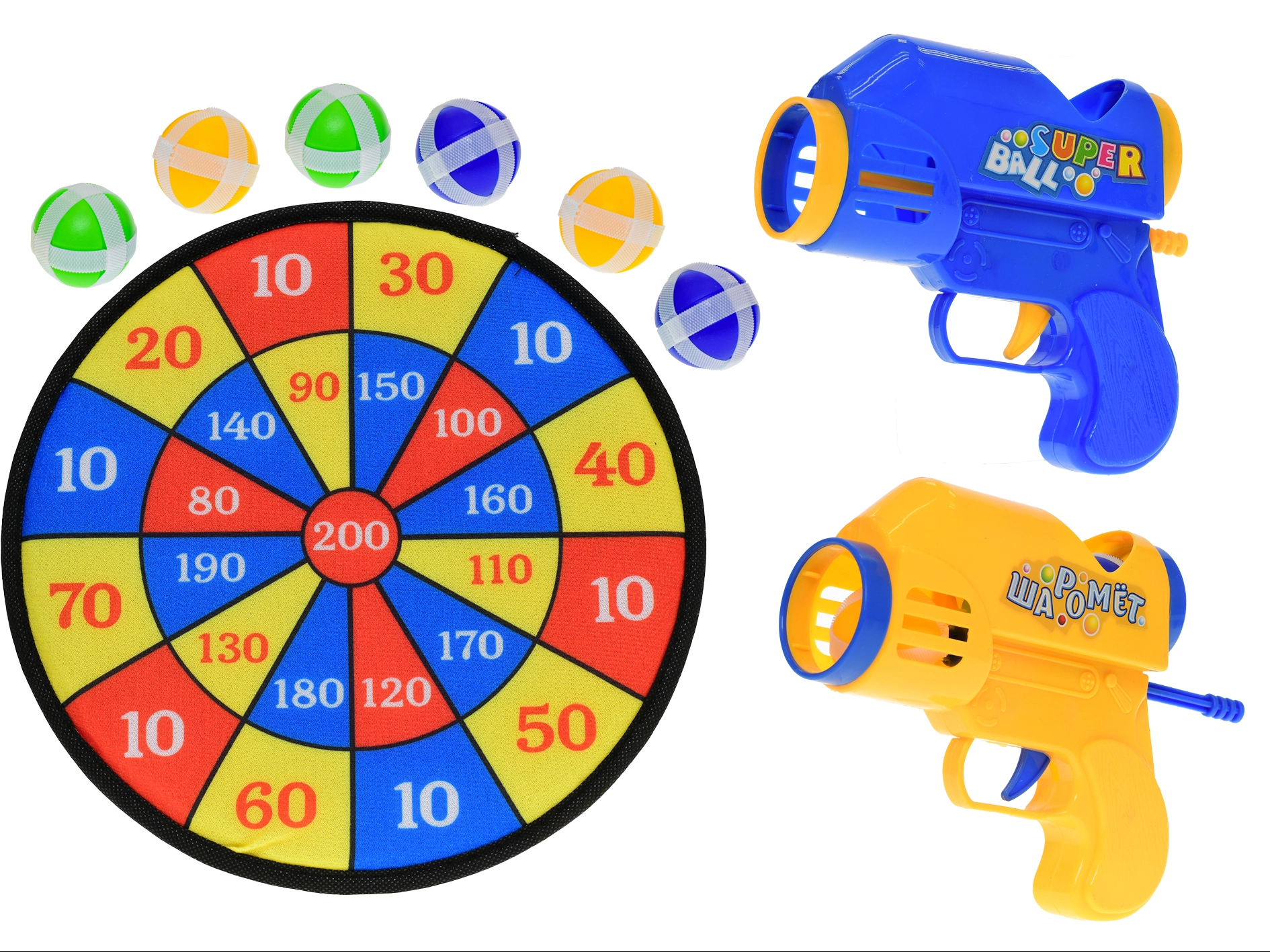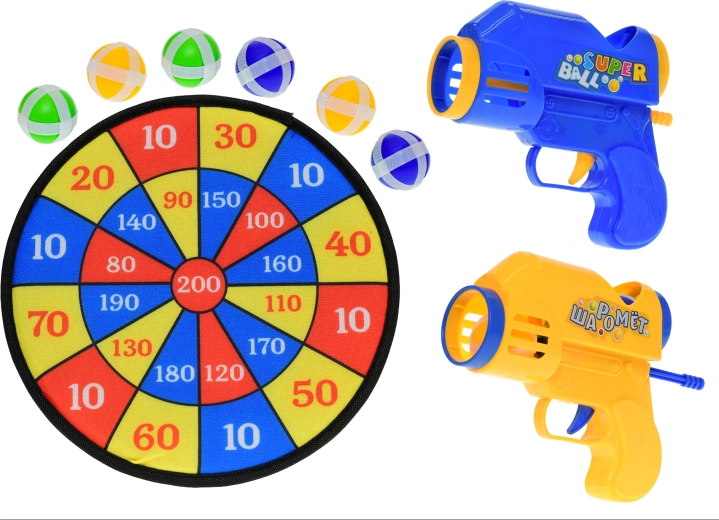 De schijf is voorzien van een oogje voor snel ophangen aan een muur of ander geschikt oppervlak. Twee lichte kunststof pistolen laten kinderen in nauwkeurigheid concurreren en helpen oog-handcoördinatie en geduld te ontwikkelen.