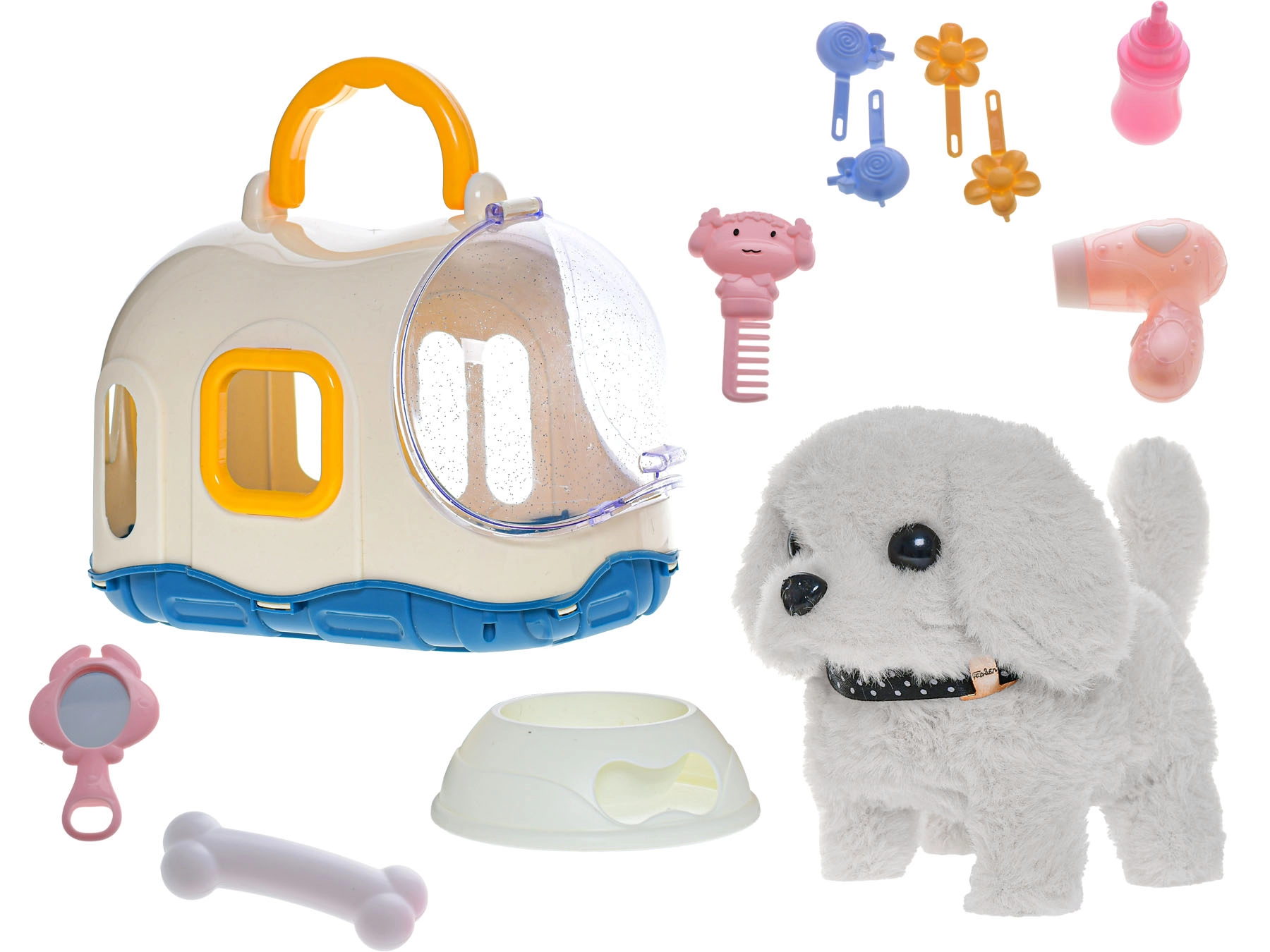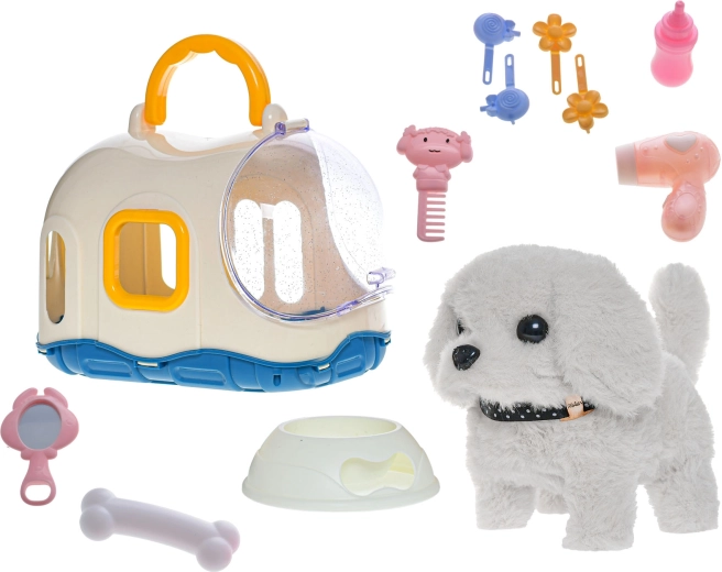 De hond is verkrijgbaar in twee kleurvarianten – wit en beige. De duurzame combinatie van pluche en plastic zorgt voor een lange levensduur, terwijl de praktische draagkooi het spel authentiek maakt en gemakkelijk meenemen op reis of bezoek mogelijk maakt.