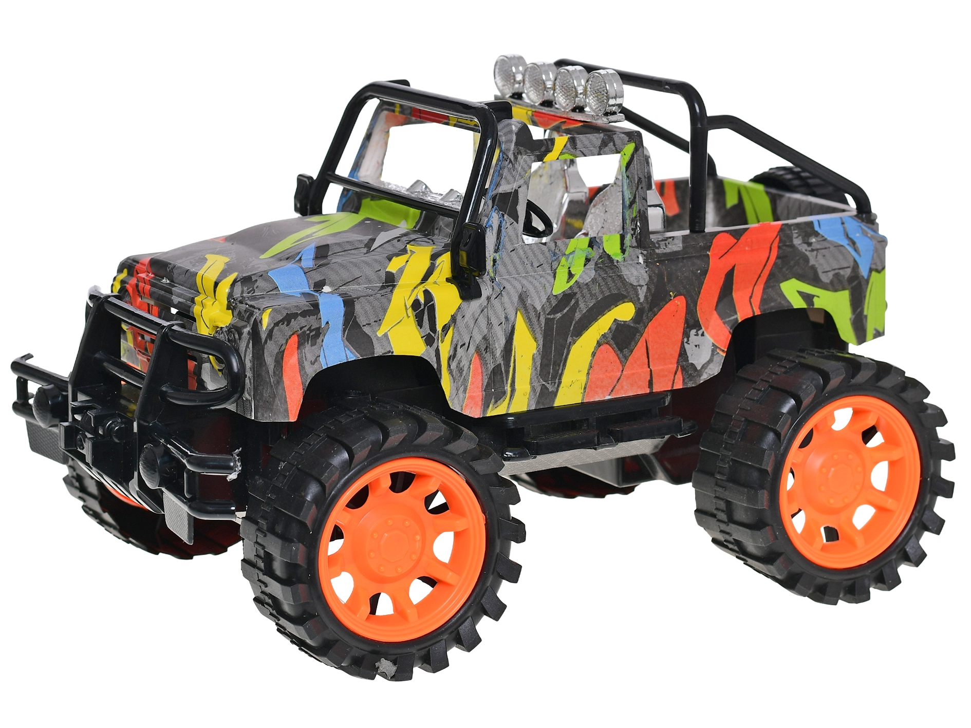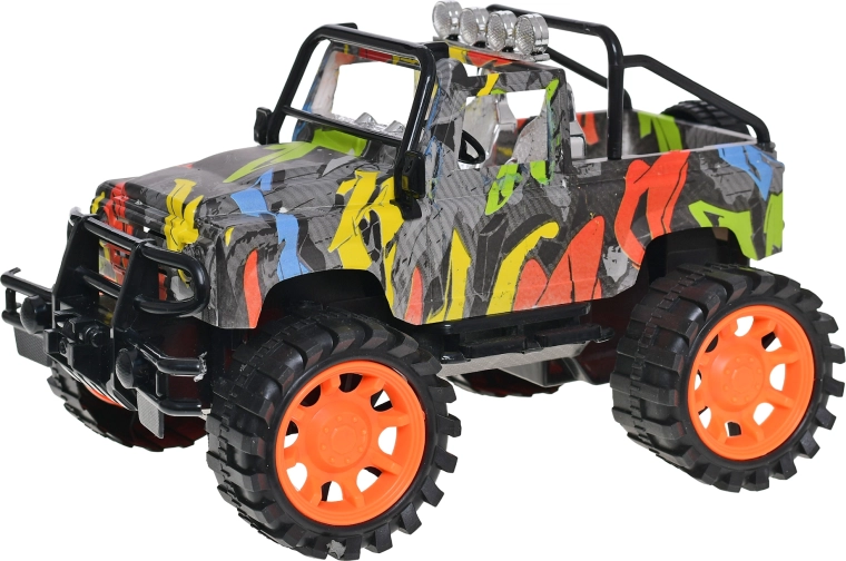 Stijlvol kunststof model van een terreinwagen op schaal 1:14 met een modern graffitidesign, goed voor langdurig speelplezier zonder batterijen. Dankzij de vliegwielaandrijving is hij gemakkelijk te bedienen, heeft een lengte van 26 cm voor een realistische rijervaring en is geschikt voor kinderen vanaf 3 jaar.