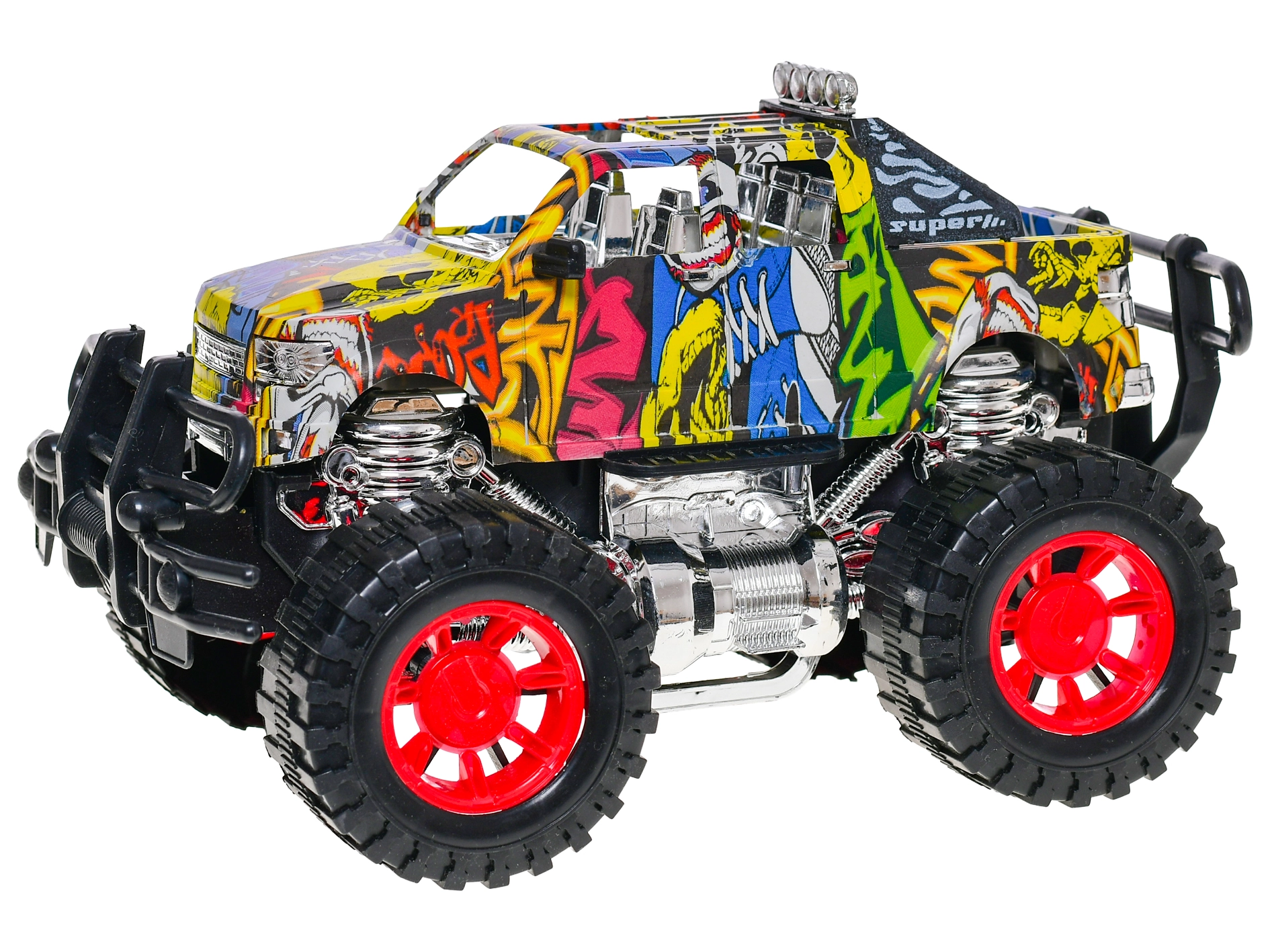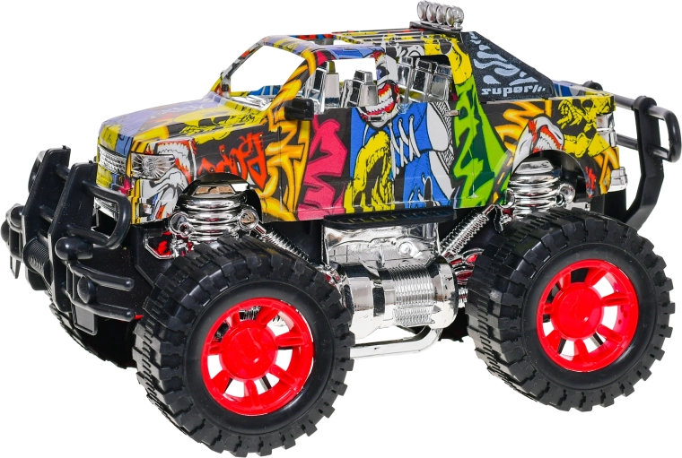 Ontdek plezier op elk terrein met deze offroad‑auto, die dankzij het vliegwielmechanisme vooruit schiet na een eenvoudige duw. Het aantrekkelijke graffiti‑design springt meteen in het oog en benadrukt het avontuurlijke karakter van het speelgoed.
